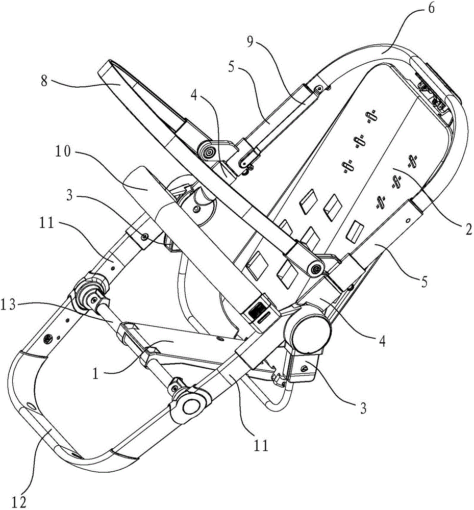 一种可调节坐兜,坐兜接口有两个并设于坐板上方的左右两侧,坐兜接口与坐板相固定并用来连接固定在车架上,在每个坐兜接口上均转动连接有坐兜上接头,在每个坐兜上接头上均固定有滑套管,且滑套管自坐兜上接头处向后延伸,上围框呈U型,上围框的两前端分别滑动连接在对应侧的滑套管上,在上围框与滑套管之间设有用来锁定上围框的调节档位,靠背板的后侧部转动连接在上围框的后侧部,靠背板的前侧部转动连接在坐板的后侧部。本实用新型的优点在于:该坐兜结构非常简单,进行调节时,坐板相对于车架固定,靠背板与坐板之间的夹角变大,从而实现靠背板的调节,且根据不同的调节档位,可以将坐兜调节到坐姿状态、半躺状态和全躺状态,调节非常方便。