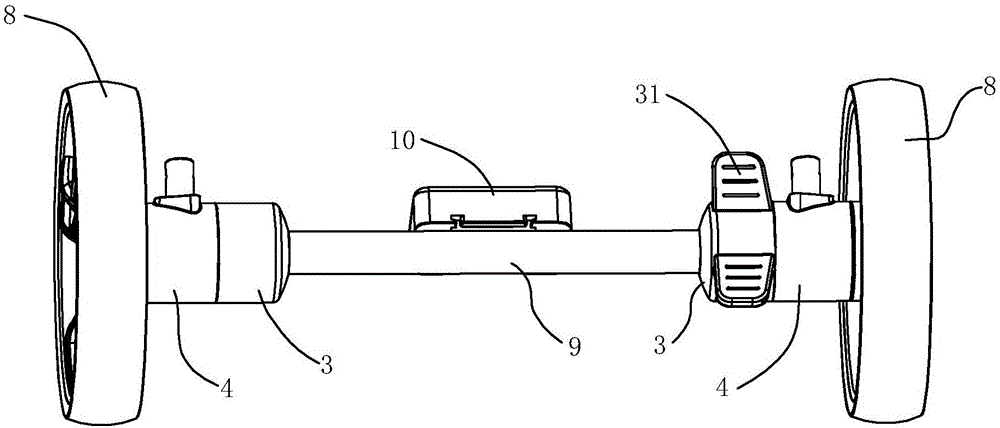 一种婴儿推车的刹车装置,包括机械式刹车模块和感应式刹车模块,感应式刹车模块包括设于后轮连接杆的端部内侧的电机,沿后轮连接杆的轴向设置的电动刹车杆,电动刹车杆在电机的驱动下沿后轮连接杆移动插入刹车槽内锁定后轮;机械式刹车模块包括位于后轮连接杆的端部与后轮之间的刹车套筒,以及与刹车套筒配合的沿后轮连接杆的轴向设置的机械刹车杆,该机械刹车杆在刹车套筒的转动驱动下沿后轮连接杆移动插入所述刹车槽内锁定后轮。该婴儿推车的刹车装置中,机械式刹车模块和感应式刹车模块为相互独立的两套系统,可以同时使用也可以分开使用,使用者可以根据需要根据方便自行选择。