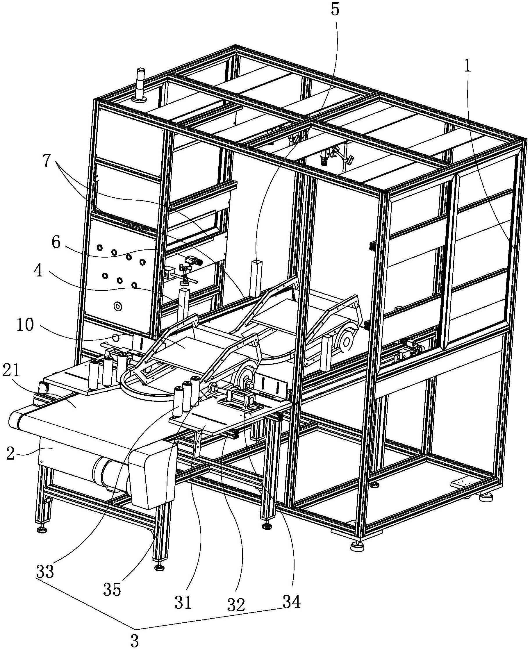 本实用新型公开了一种车架铆钉检测设备,包括机架、输送带、导正机构、两个前位置传感器、两个后位置传感器、工业摄像机、光源;所述的输送带安装在机架中部,导正机构安装在机架中部且位于输送带的两侧,两个前位置传感器和两个后位置传感器皆安装在机架上且两个前位置传感器和两个后位置传感器分别位于输送带的两侧,工业摄像机安装在机架上且位于输送带的上方,光源安装在机架上且位于输送带的斜上方。由于本实用新型的输送带推动车架通过前位置传感器时,导正机构工作,对车架进行精确定位。输送带继续推动车架通过后位置传感器,工业摄像机配合LED灯拍下车架图片并进行精准比对,可进一步对车架进行人工修正,具有定位准确的优点。