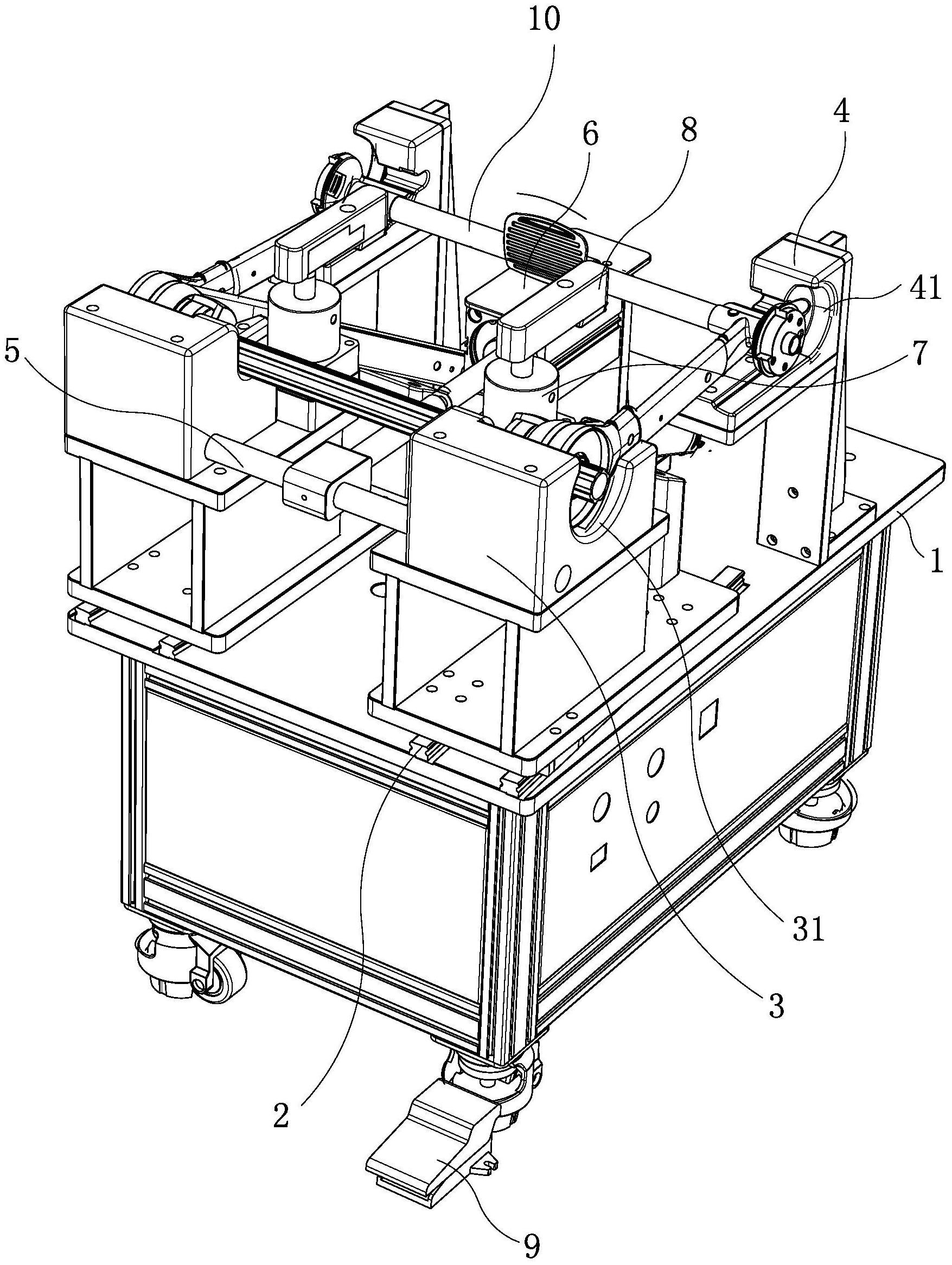 本实用新型公开了一种童车中央关节压合后悬架装置,包括装配机台、滑轨、活动定位座、支撑座、连接杆、伸缩气缸、摆动气缸、压块;所述的滑轨固定在装配机台上,活动定位座滑接在滑轨上,伸缩气缸的缸体固定安装在装配机台上,伸缩气缸的活塞杆杆端通过连接杆与活动定位座连接,摆动气缸固定安装在装配机台上,摆动气缸的活塞杆杆端与压块连接。由于本实用新型的摆动气缸驱动压块将放置在活动定位座与支撑座上的车架组件定位,滑接在在滑轨上的活动定位座在伸缩气缸的驱动下可相对支撑座移动,将放置在活动定位座与支撑座上的车架组件套接在一起,套接平稳、可靠。