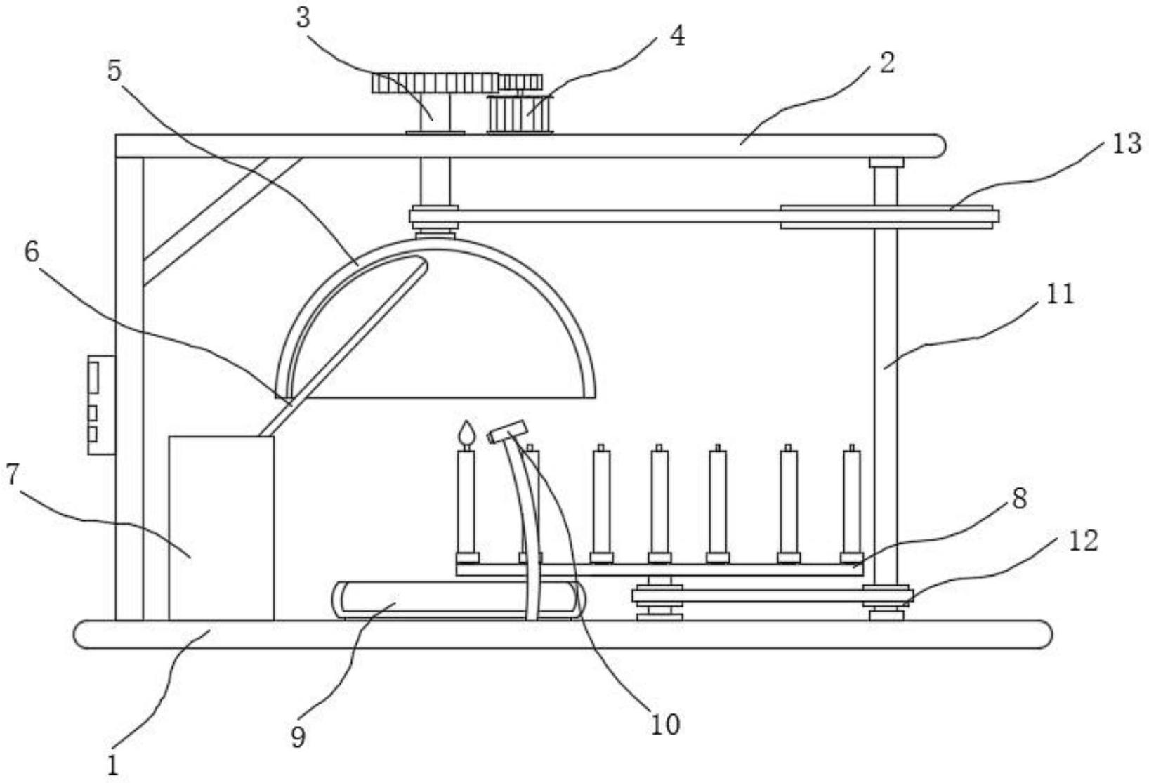 本实用新型提供一种徽墨生产用墨粉收集装置,涉及徽墨生产设备技术领域,该徽墨生产用墨粉收集装置,包括底座,底座顶部安装有支架,支架上贯穿有与其转动连接的主动杆,主动杆下方连接有集粉壳,集粉壳正下方设有燃烧管件;伺服电机,伺服电机安装于支架顶部,伺服电机顶端连接有小齿轮,主动杆的顶端固定有与小齿轮啮合的大齿轮;集粉筒,集粉筒顶部连接有与集粉壳相适配的刮粉件,该徽墨生产用墨粉收集装置,操作连续,可自动更换燃烧管件的位置并点燃进行烟粉的收集操作,减少了单位时间内人工干预的次数,延长持续集粉的时间,利于提高集粉效率,同时也降低了墨粉收集工作的强度。