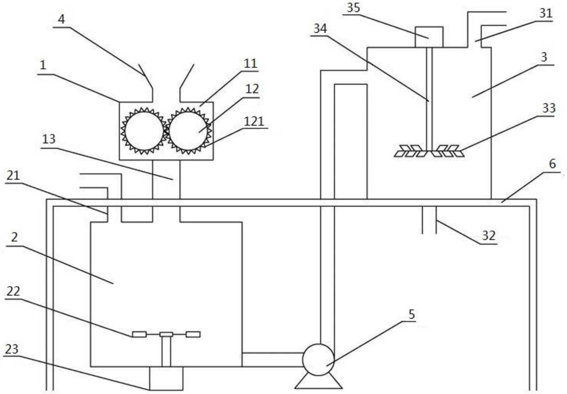 本实用新型公开了一种用于粉体超细化分散及液体浆料制备的加工设备,包括粉体颗粒粉碎装置、混合釜和高速分散筒;粉体颗粒粉碎装置的进料口连接投料装置;粉体颗粒粉碎装置包括粉碎槽体和粉碎辊;该粉体颗粒粉碎装置的出料口与混合釜连接;混合釜上设有液体进料管,混合釜内设有搅拌桨,搅拌桨与第一电机连接;混合釜的出料口与高速分散筒连接;高速分散筒上设有助剂进料管和出料管,高速分散筒内设有分散盘,分散盘通过连接轴与第二电机连接。该设备可以连续对粉体材料进行粉碎以及与液体进行混合和分散,以制备液体浆料,具有结构简单、超细化分散效率高、能耗和生产成本低等优点。