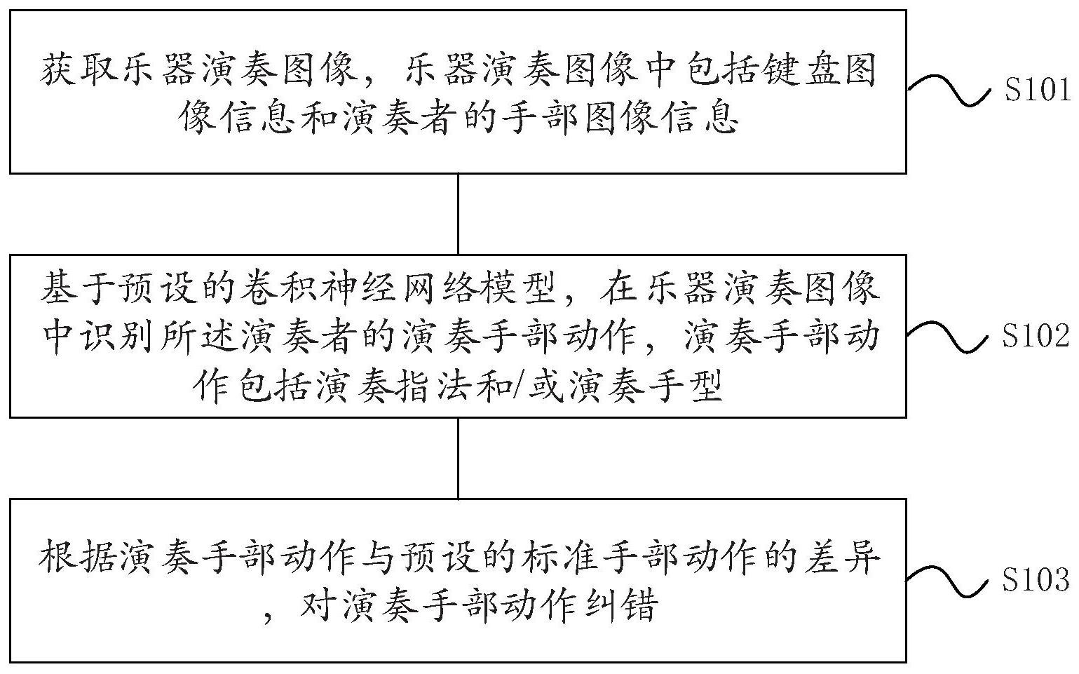 本申请实施例公开一种乐器演奏手部动作的纠错方法、装置及电子设备,涉及乐器演奏技术领域,为有效提高演奏手部动作的纠错效率而发明。所述方法包括:获取乐器演奏图像,所述乐器演奏图像中包括键盘图像信息和演奏者的手部图像信息;基于预设的卷积神经网络模型,在所述乐器演奏图像中识别所述演奏者的演奏手部动作,所述演奏手部动作包括演奏指法和/或演奏手型;根据所述演奏手部动作与预设的标准手部动作的差异,对所述演奏手部动作纠错。本申请实施例适用于对乐器演奏手部动作进行纠错。