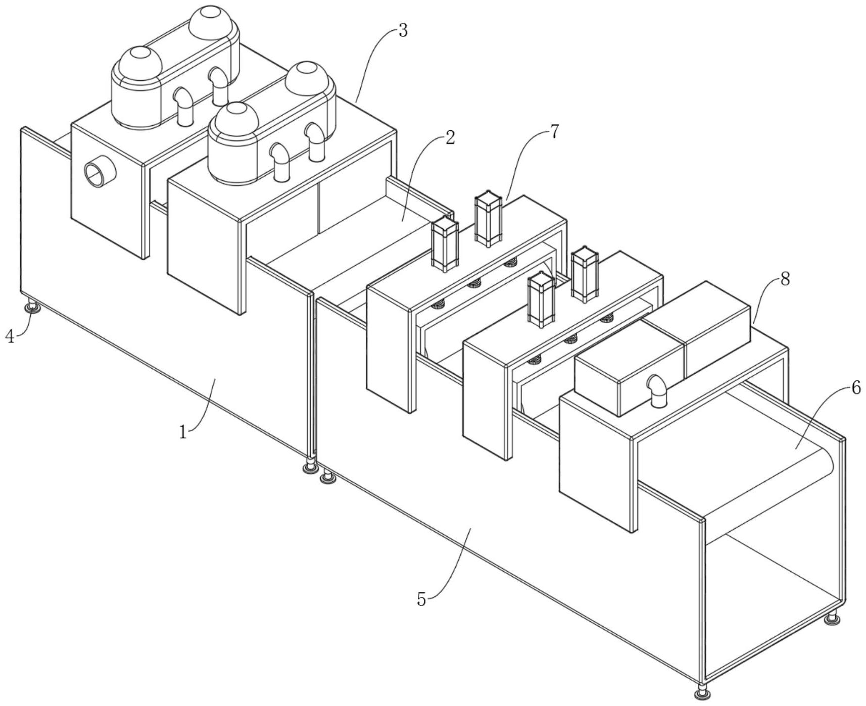 一种纸尿裤柔软层热粘合装置,包括第一输送座,所述第一输送座的内部设有第一输送带,所述第一输送座的外侧且位于第一输送带的上方设有两组加热机构,所述第一输送座的底部设有四组支撑脚,所述第一输送座的正面设有第二输送座,所述第二输送座的内部设有第二输送带,所述第二输送座的外侧且位于第二输送带的上方设有两组热压机构,所述第二输送座的外侧且位于热压机构的前方设有冷却机构;所述热压机构包括热压座,所述热压座固定连接于第二输送座的顶部,所述热压座的顶部固定连接有两组升降气缸,所述热压座的底部且位于升降气缸相对应的位置处设有升降座,所述升降座的内部设有热压辊,本实用新型通过设计提高了热粘合装置整体的实用性。