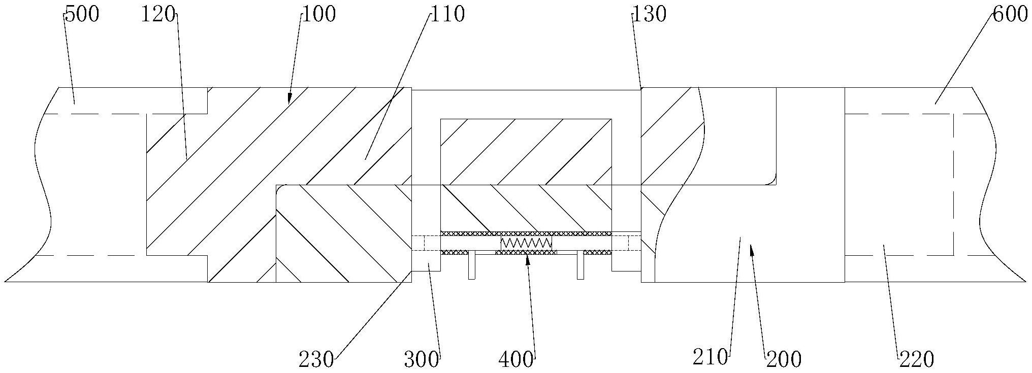 本实用新型提供了一种轨道连接结构,属于过山车设备结构技术领域,包括第一块体、第二块体、U形杆以及锁紧结构。第一块体端部设有第一插接块;第二块体端部上设有第二插接块,第二插接块与第一插接块相互搭接;U形杆的两个自由端依次贯穿第一插接块和第二插接块;锁紧结构包括位于设于两个自由端之间的筒体以及沿筒体轴向滑动的两个插接件,两个插接件分别插装于两个自由端,穿入第一插接块和第二插接块的端部。本实用新型提供的一种轨道连接结构,通过U形杆的两个自由端穿过第一插接件和第二插接件,锁紧结构的两个插接件插入到U形杆的两个自由端,将第一插接块与第二插接块定位并锁紧,使第一管体和第二管体快速可靠连接。