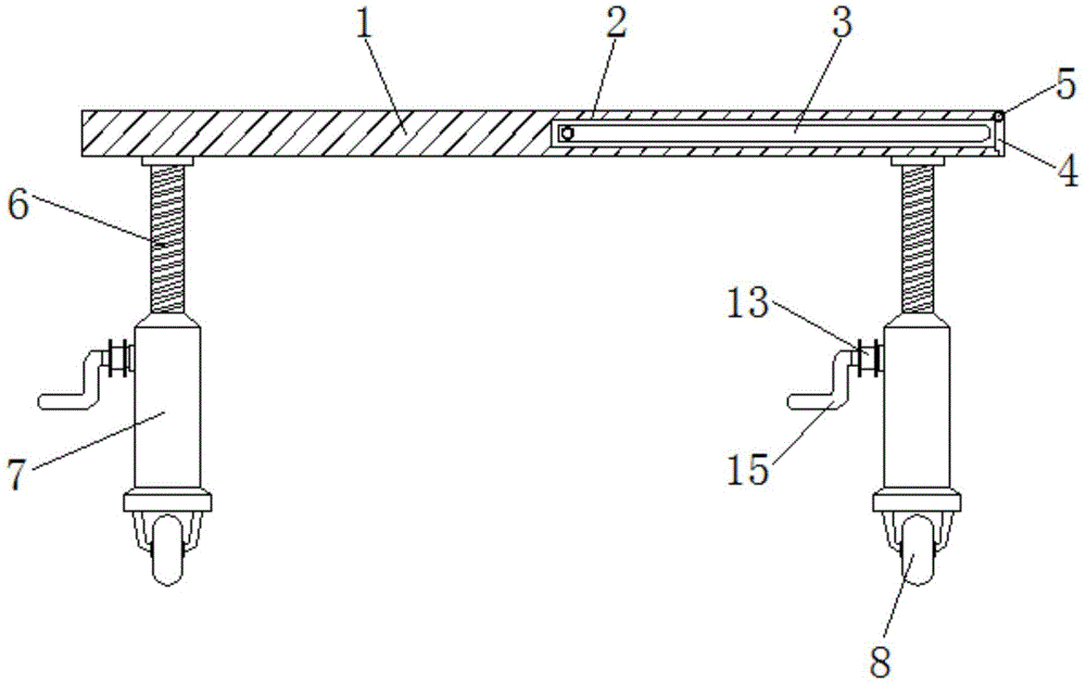 本实用新型公开了一种便于升降的纺织用蒸化锅送料装置,包括承托板、第一支撑杆和第二锥形齿轮,所述承托板的内部开设有连接槽,且连接槽的内侧设置有过渡板,所述连接槽的外侧设置有封闭板,且封闭板通过连接轴与承托板相互连接,所述第二锥形齿轮位于第一锥形齿轮的外侧,且第二锥形齿轮位于第二支撑杆的内部,所述第二锥形齿轮上安装有横轴,且横轴上连接有传动轮,所述横轴上连接有摇杆。该便于升降的纺织用蒸化锅送料装置,采用摇杆带动第二锥形齿轮和第一锥形齿轮进行运动,从而方便第一锥形齿轮通过螺纹对第一支撑杆进行调节,进而实现了该送料装置高度的调节,简化了调节步骤,方便进行操作。