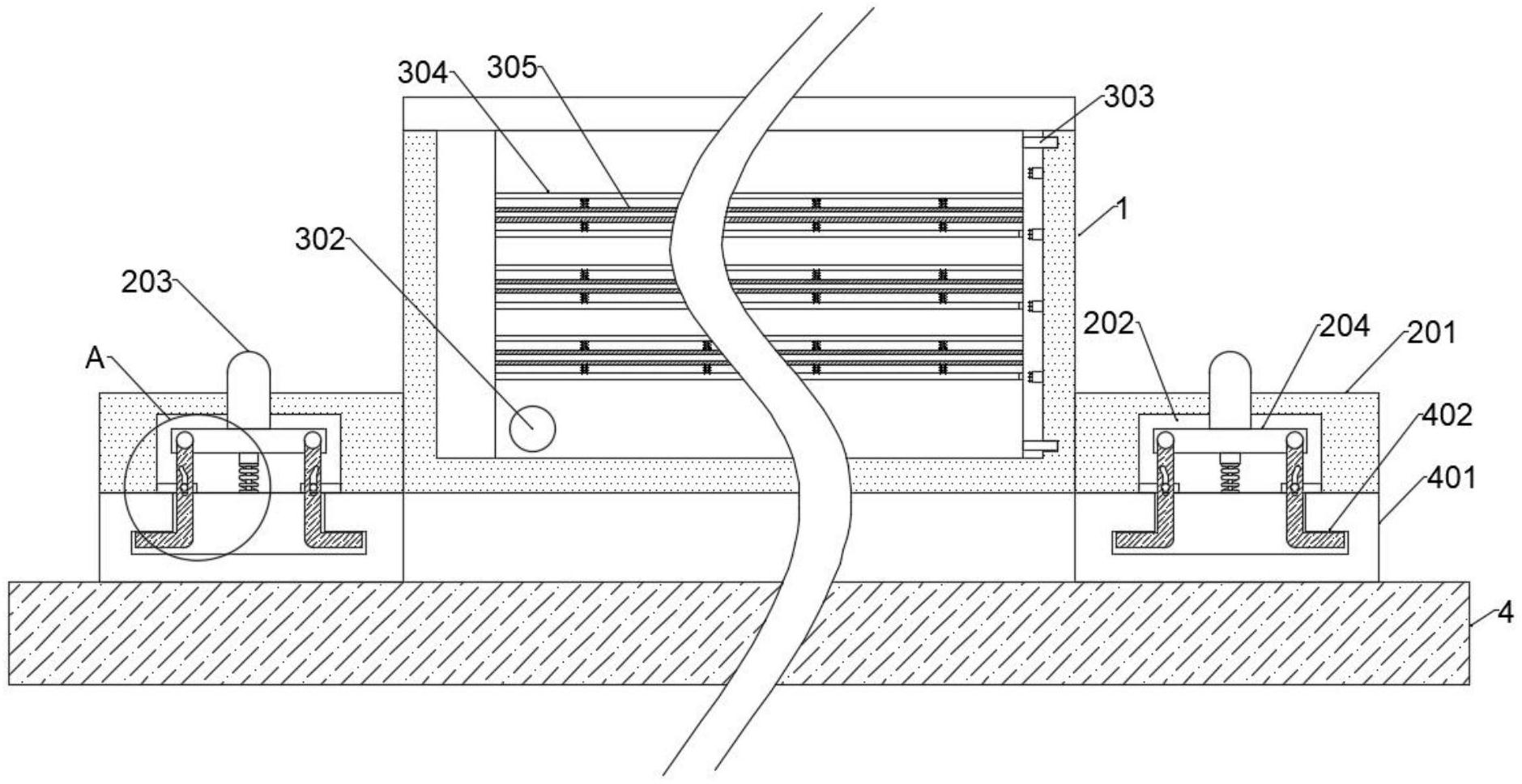 本实用新型公开了一种固定于灯体上的拨码开关调色温面板灯电源结构,涉及电源结构技术领域,用于解决电源盒内的电源难以方便快捷的拆装,还有因电源规格不同导致安装不牢固,以及现有电源盒大多通过螺栓固定在灯体上,拆装缓慢问题,包括电源盒、紧固组件、夹持组件和面板灯,夹持组件包括移动板,电源盒的内部对称安装有移动板,电源盒内部安装有螺纹杆,螺纹杆的一端贯穿电源盒延伸至外部,螺纹杆的另一端与电源盒内壁通过轴承活动连接;本实用新型通过设置有紧固组件和夹持组件,实现对不同规格的电源进行牢固的夹持,以及能够方便快捷的安装电源盒,省时省力,避免出现损坏元件或者电路连接不良的问题。