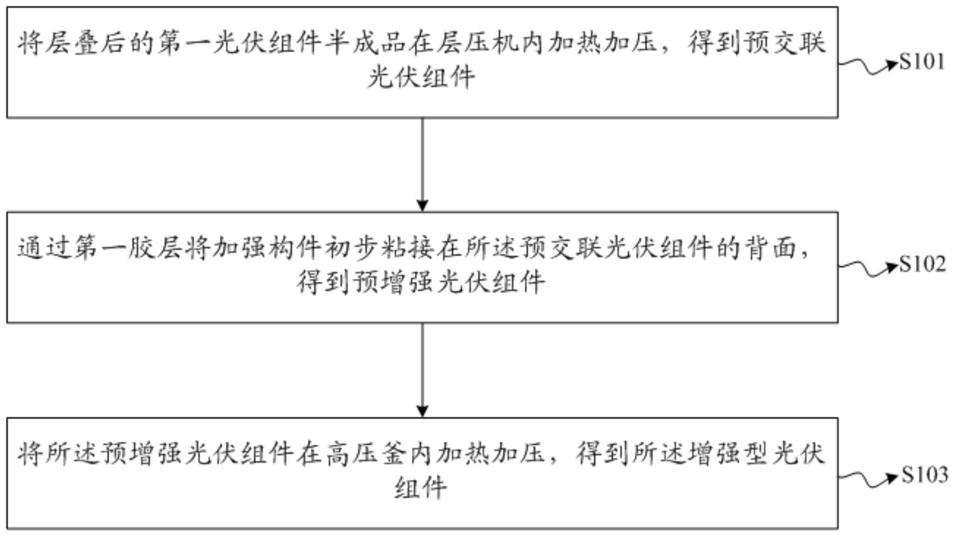 本申请实施例公开了一种光伏组件的加工方法,首先制作预交联光伏组件,然后在预交联光伏组件的背面粘接加强构件得到预增强光伏组件,最后将预增强光伏组件在高压釜内进行交联,得到机械性能增强的光伏组件。通过光伏组件加工方法制得的光伏组件的机械性能是第一光伏组件和加强构件的机械性能的叠加,相对于第一光伏组件的机械性能增强,扩大光伏组件的适用范围;同时第一光伏组件半成品仅在层压机的第一腔体内加工,制成预交联光伏组件,缩短预交联光伏组件的加工时间,同时预增强光伏组件在高压釜内制成机械性能增强的光伏组件,高压釜能够对预增强光伏组件进行批量加工,进一步提高了光伏组件的加工效率。