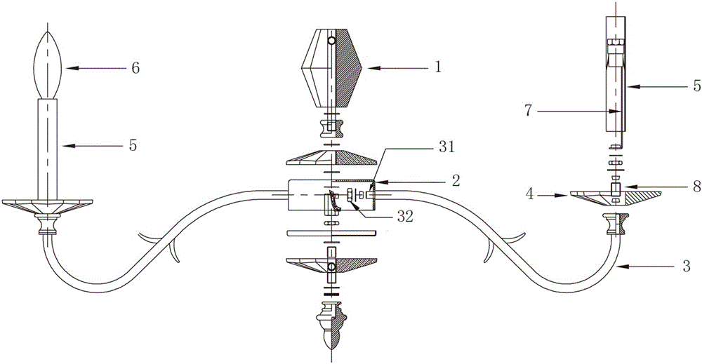 一种吊灯烛形光源安装结构,包括吊灯架和烛形光源组件,所述烛形光源组件包括光源安装座、弯管和烛形光源,所述弯管一端为与光源安装座固定连接的固定端,另一端为将烛形光源固定的光源端;所述弯管为中空结构,烛形光源的电线从光源安装座穿过弯管与烛形光源电性连接。所述弯管固定端的外表面设有螺纹,螺纹段的弯管穿过光源安装座的薄壁,并通过设于光源安装座内侧的安装螺母锁紧固定。所述螺纹段的弯管直径小于光滑段的弯管。本实用新型提供的吊灯烛形光源安装结构,弯管为空心体,方便电线穿过;弯管固定端的螺纹段直径略小,方便安装时卡接定位;整体结构简单,安装稳定。