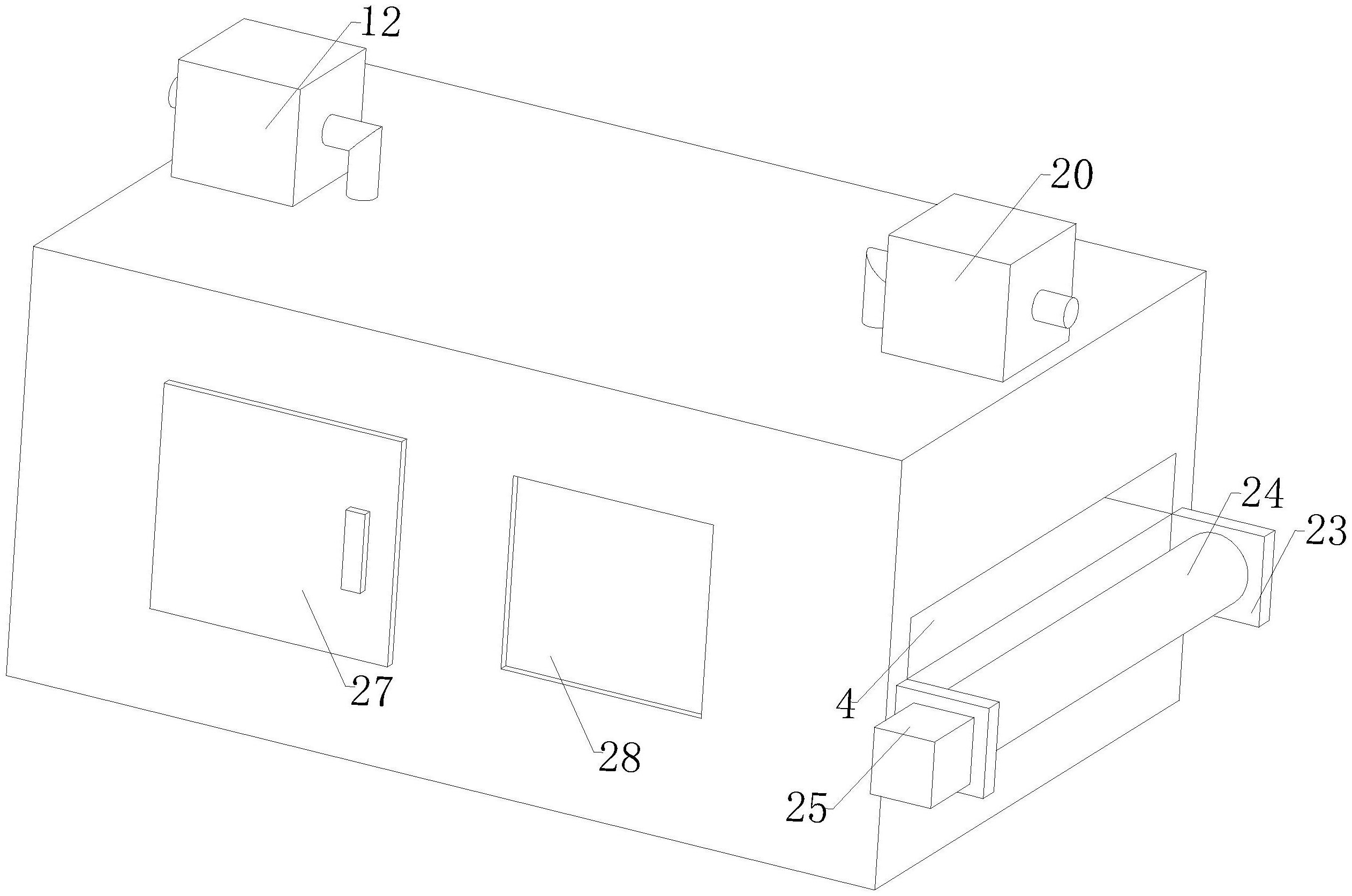 本实用新型涉及印花设备技术领域,具体为一种毛巾套印印花设备,包括工作箱,所述工作箱内置工作空腔,所述工作空腔左右两侧侧壁对应位置分别设置进料口以及出料口,所述工作空腔位于进料口下方设置工作台,所述工作空腔顶端设置一组液压杆,所述液压杆底端设置印花结构,所述工作空腔位于液压杆左侧依次设置展平装置以及除尘装置,所述工作空腔位于液压杆右侧设置烘干装置,所述工作箱右侧侧壁位于出料口下方设置收卷装置,通过除尘装置的设置,便于在毛巾布料的上下两侧分别进行抽风以及吹风,同时配合清理刷毛对毛巾布料表面的梳理,从而便于对毛巾布料内的灰尘以及杂质进行清理,从而提升印花效果。
