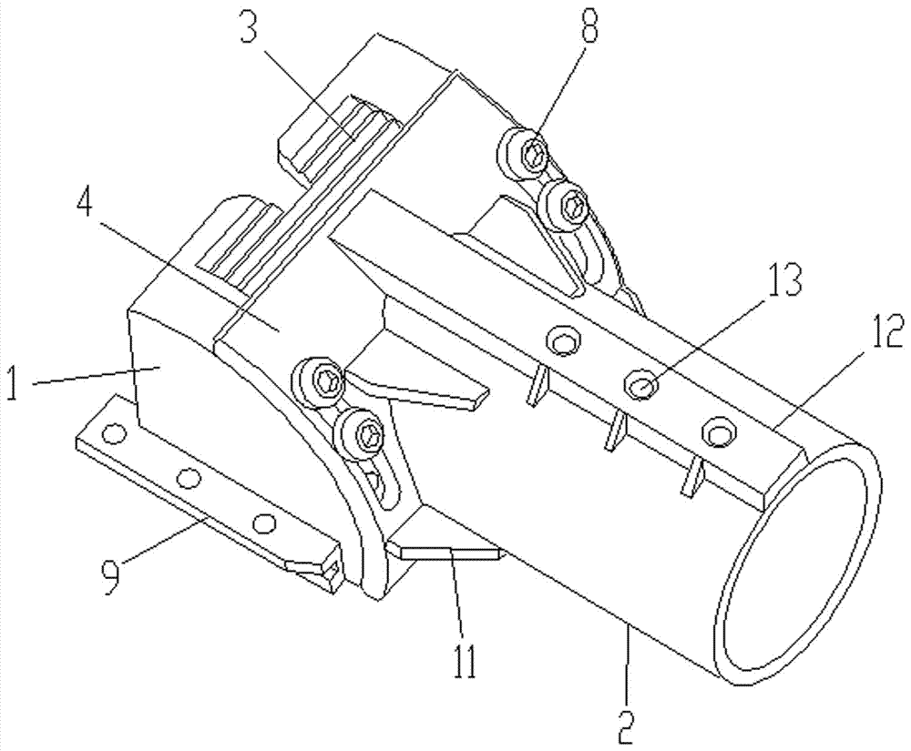 实用新型公开了一种路灯的角度调节机构,包括底座和安装臂,所述底座上表面呈弧形设置,所述底座表面中部均布有第一阶梯纹,所述安装臂一端设有呈弧形的连接件,所述连接件内侧中部均布有第二阶梯纹,所述第一阶梯纹和第二阶梯纹吻合连接,所述第一阶梯纹两侧的底座上设置有圆孔,所述第二阶梯纹两侧的连接件上设置有条形通孔和固定螺丝,所述固定螺丝穿过条形通孔和圆孔。本实用新型的路灯的角度调节机构容易进行角度的调节,结构稳定性高。