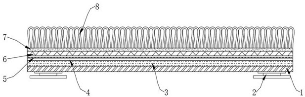 本实用新型公开了一种新型阻燃型地毯,包括底板、表层和绒毛,所述底板的顶端固定有阻燃板,且阻燃板的顶端固定有乳胶,所述乳胶的顶端固定有表层,所述表层的顶端设置有防渗结构,所述表层的顶端设置有绒毛,所述绒毛的两侧均设置有固定结构,所述固定结构包括插头、卡槽、卡块和卡销,所述卡槽均插设在底板的内部,所述卡槽的底端插设有插头。本实用新型将卡销插入卡槽内部,通过变形复位,使卡销与卡槽固定在一起防止结构分裂,通过将插头固定在地板上,使插头进入卡槽的内部进行卡合固定,从而达到防滑固定的效果,由此实现了此装置的固定防滑功能,使地毯不会随意滑动,从而提高使用的安全性。