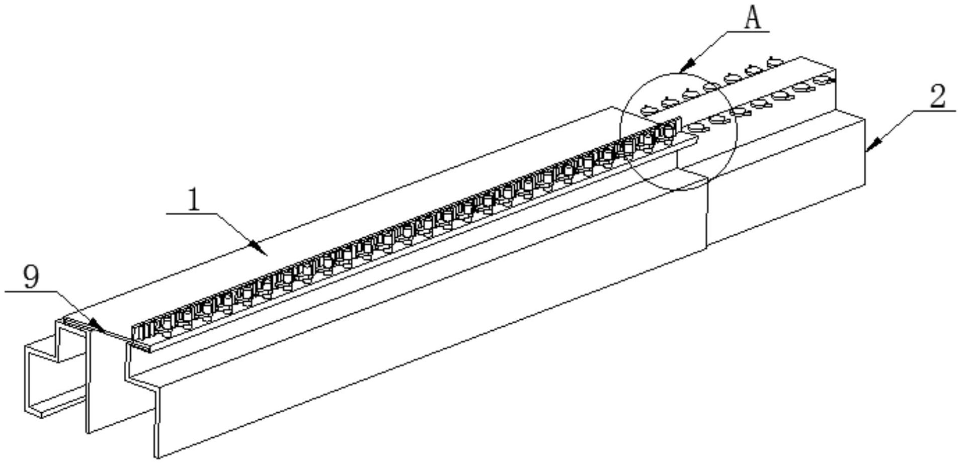 本实用新型公开了可伸缩调距的电动窗帘导轨,包括上导轨和下导轨,所述下导轨卡接于上导轨内部,所述下导轨外侧设置有传动组件,所述上导轨内部设置有卡紧组件,所述传动组件包括弹片和多个圆轮,多个所述圆轮分别固定连接于下导轨两侧,所述弹片固定连接于圆轮外侧。该可伸缩调距的电动窗帘导轨拉动下导轨向右运动,第二棘爪会由于圆轮的限位进而使下导轨不能向右运动,齿条对第一棘爪进行限位,此结构有益于调节伸缩杆的长度同时对其进行限位,方便快捷,操作简单,节省时间,节省人力,拔出齿条,第一棘爪失去齿条对其的限位,推动下导轨向左运动,此结构有益于重复使用伸缩导轨,操作方便快捷,节省时间,节省人力。
