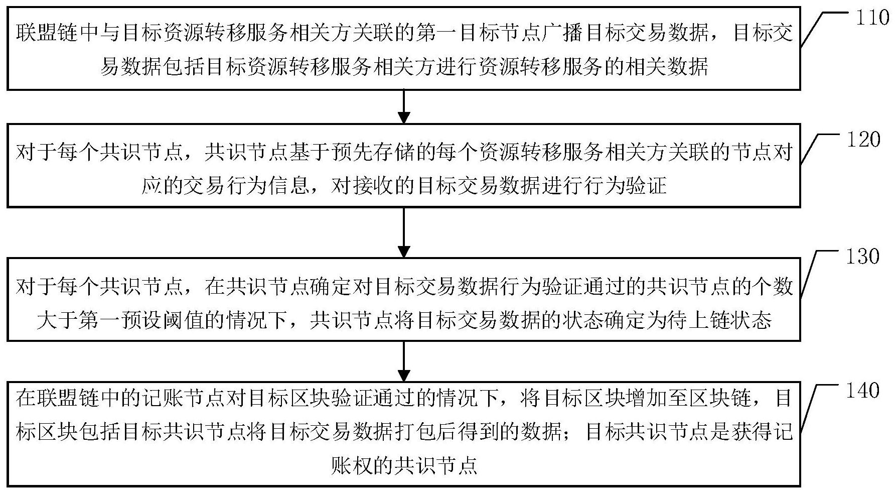 本申请公开了一种数据存储方法和联盟链系统。该方法应用于联盟链,包括:联盟链中与目标资源转移服务相关方关联的第一目标节点广播目标交易数据;对于每个共识节点,共识节点基于预先存储的每个资源转移服务相关方关联的节点对应的交易行为信息,对接收的目标交易数据进行行为验证;对于每个共识节点,在共识节点确定对目标交易数据行为验证通过的共识节点的个数大于第一预设阈值的情况下,共识节点将目标交易数据的状态确定为待上链状态;在记账节点对目标区块验证通过的情况下将目标区块增加至区块链,目标区块包括目标共识节点将目标交易数据打包后得到的数据;目标共识节点是获得记账权的共识节点。能够提高数据的安全性。