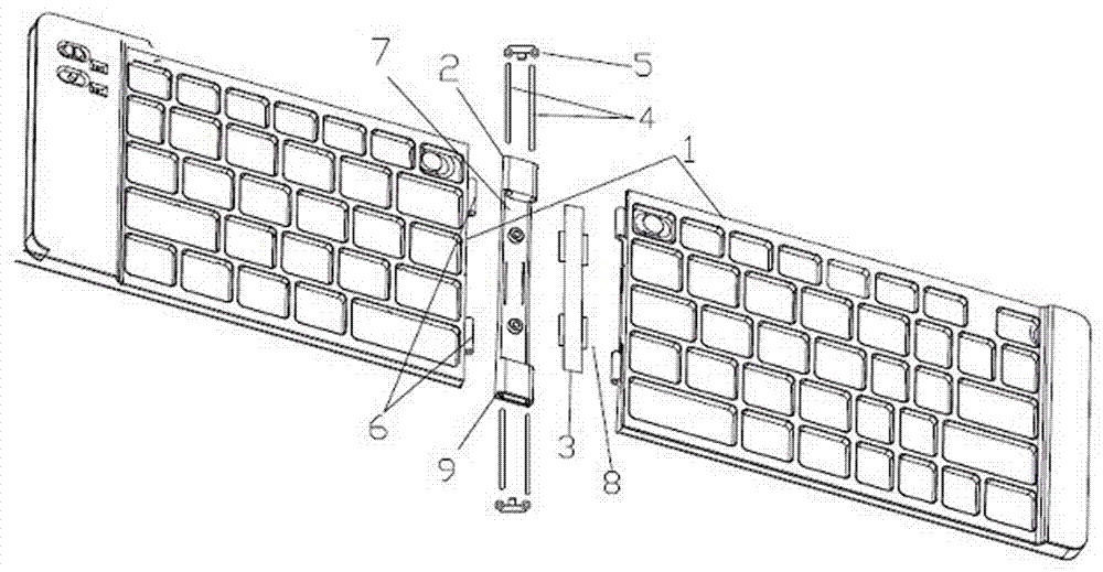 本实用新型公开了一种折叠键盘,包括由两个外形框以及用于连接两个外形框用的折叠件组成的折叠键盘,所述折叠件包括外挡板、内挡板、钢针以及钢针塞子组成,两个外形框的相对开口端设置有两个第一耳扣,外挡板设置于两个外形框之间,外挡板的上端面设置有一个装配腔,装配腔的上端通过内挡板密封,所述内挡板的两侧错开第一耳扣设置有第二耳扣,外挡板中间设置有钢针插孔,钢针插孔设置有两个钢针穿过钢针插孔以及第一、第二耳扣。本实用新型的折叠件的连接部替代现有的折叠键盘的铰链或机械转轴,闭合打开更容量弯折,耐用,容易制造,寿命长,便于携带与使用,此外,折叠件的设置还可对键盘起到一定的保护作用。