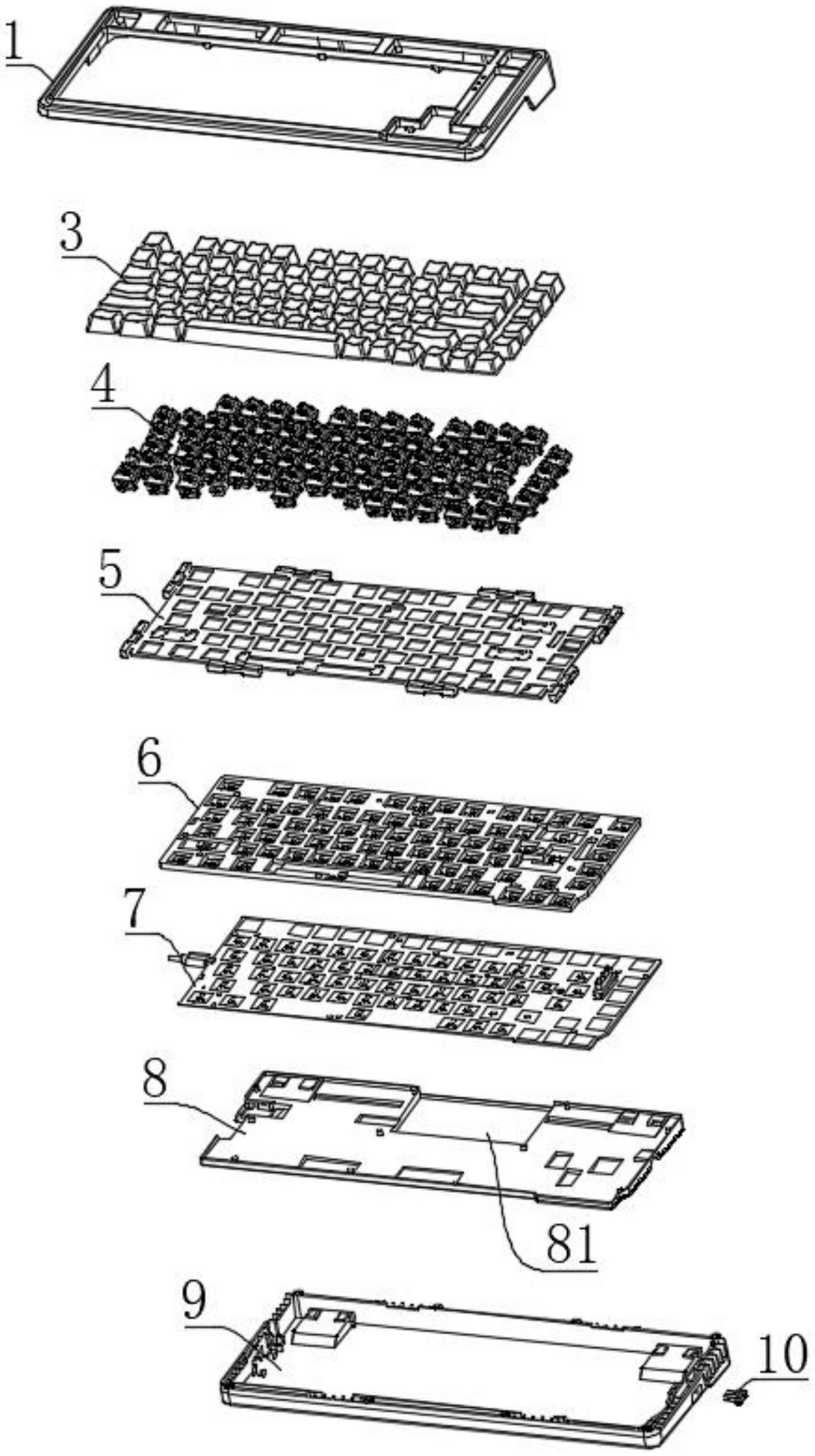 本实用新型公开了一种弹压平衡悬浮结构机械键盘,包括透明上盖和透明底壳以及用于连接电脑的接收器,PCB板与透明上盖之间安装有起到静音作用的塑胶中板,塑胶中板的四个侧壁两侧均一体成型有插件,插件的侧壁均插接有用于防振的塑性橡胶压枕,透明底壳的一侧侧壁一体成型有收纳仓,收纳仓的内部开设有收纳槽,接收器插接安装于收纳槽的内部,同时又在PCB板的顶面和底面均分别安装有上硅胶垫和下硅胶垫,使得该弹压平衡悬浮结构机械键盘使用噪音和回音极小,从而在办公场所使用时,能够减少对别的办公人员的影响,将接收器由现有的安装在键盘的底面转移到安装在透明底壳的侧壁上,避免了接收器遗失或者掉落的情况发生。
