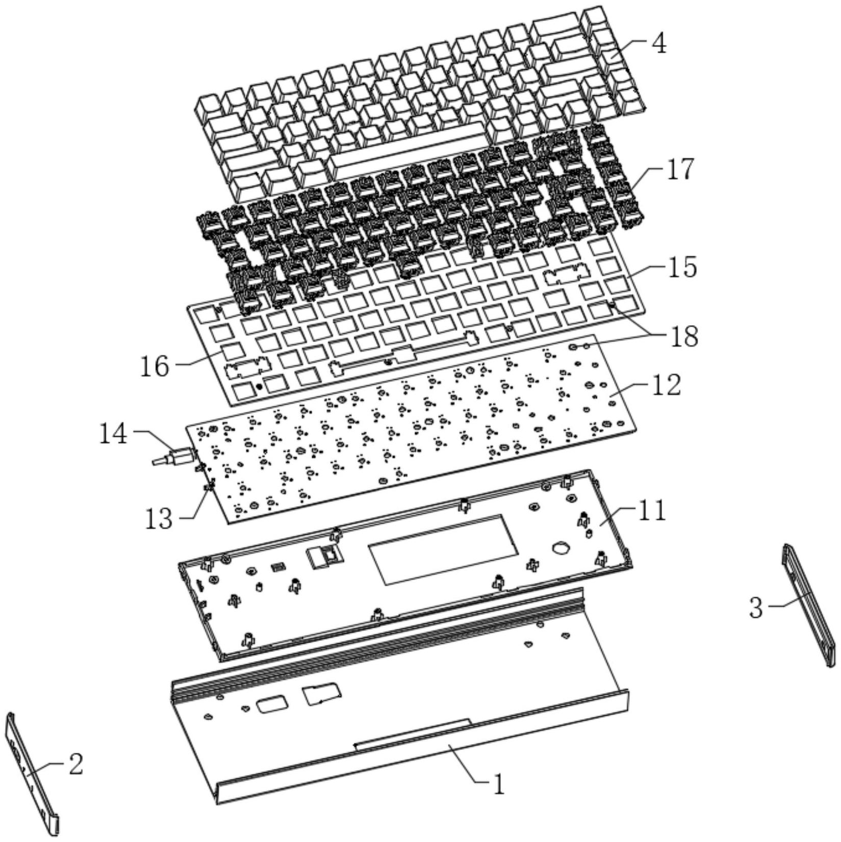 本实用新型公开了一种卡扣榫卯结构的机械键盘,包括下壳体、左侧板、右侧板和安装面板,U形框架构成下壳体的主体,U形框架的两侧内侧壁均设有插接部,第一榫槽开设于插接部的侧壁上,第二榫槽分别开设于U形框架的左右两侧侧壁上;左侧板靠近U形框架左侧的两边均一体成型有左榫头,左榫头插接于U形框架左侧的第二榫槽中,右侧板靠近框架右侧的两边均一体成型有右榫头,右榫头插接于U形框架右侧的第二榫槽中,载板的两侧分别一体成型有条形榫头,条形榫头插接于插接部侧壁上的第一榫槽中,能够保证组装后的下壳体能够更加稳固,且部件与部件之间连接更加紧密,接缝平整,且上下左右四个方向的缝隙均匀,适合生产。
