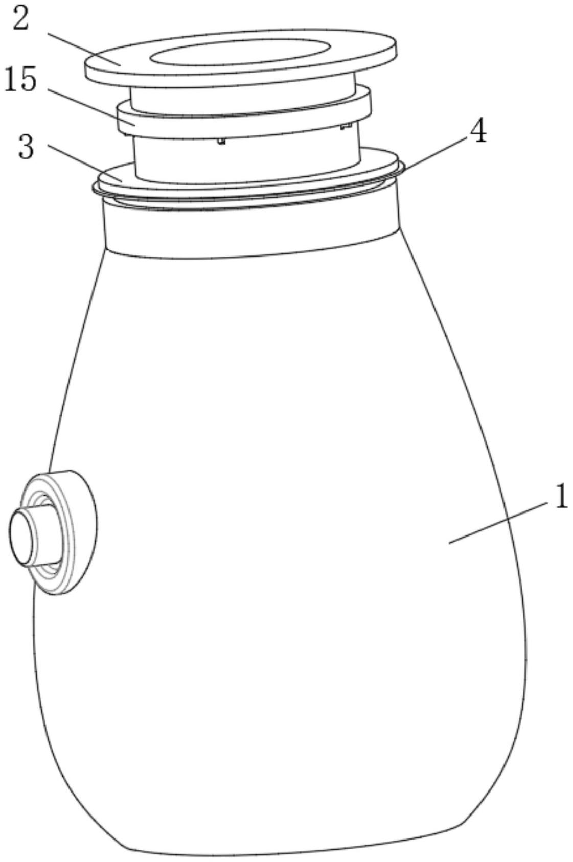 本实用新型公开了一种食物垃圾处理机的安装结构,包括安装壳体、收集管密封装置和,所述收集管外侧固定装有密封环,所述收集管插接在安装壳体中,所述密封装置用于对安装壳体与收集管之间进行密封和减震,防止异味散发和减震,所述密封装置与安装壳体固定,此食物垃圾处理机的安装结构在将安装壳体固定在收集管上时,不再采用螺纹固定,而是卡接,可以对安装壳体进行快速的定位安装,且密封装置可以很好将收集管与安装壳体之间密封起来,防止异味散发,且密封装置中的减震弹簧,能更好的减少安装壳体与收集管之间的震动。
