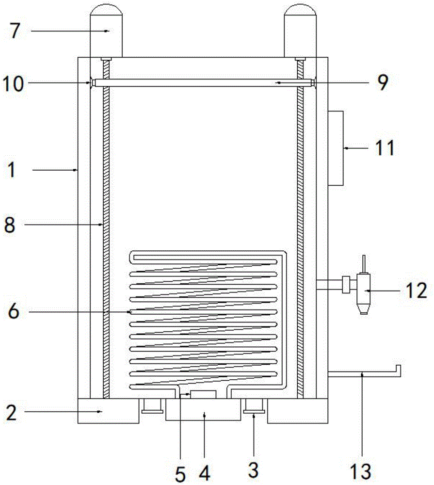 本实用新型公开了一种具备除垢功能的热水锅炉,包括:炉体,所述炉体整体呈矩形结构设置且炉体的底部设有底座,所述炉体的顶部设置两组电机且电机通过螺栓与炉体之间固定连接,所述电机的动力输出端设有螺杆且螺杆的表面设有安装架。本实用新型在炉体的顶部设置两组电机且电机的动力输出端设置螺杆,螺杆的表面设置安装架且安装架整体呈矩形框架结构设置,安装架的内侧设有凸块且凸块的内部设有螺纹孔,螺杆插接在螺纹孔内部并与其螺纹连接,从而带动安装架在炉体内部上下移动,同时安装架的侧面设置刮板且刮板两侧呈弧形结构设置,其边缘处呈扁平状结构,刮板与炉体内壁相互接触,可以对炉体内壁表面的水垢进行刮除。