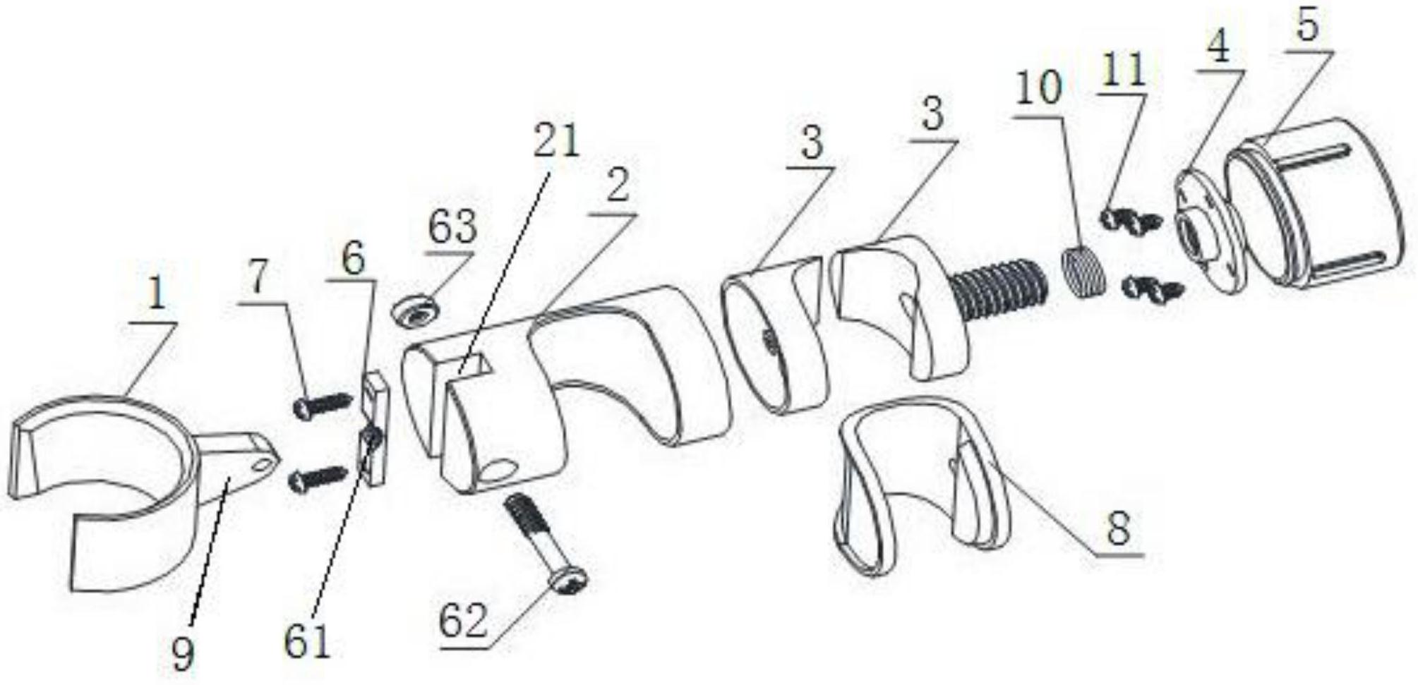 本实用新型公开了一种花洒座,该花洒座上由左至右依次设置有基座、壳体、两个夹紧件、旋钮和旋钮底座;在基座和壳体之间滑板,滑板两端设有螺纹孔,滑板通过螺丝固定在壳体上;两个夹紧件之间固定有硅胶摩擦垫;夹紧件下端设有一螺杆,旋钮安装在旋钮底座上,螺杆穿过通孔将夹紧件、旋钮和旋钮底座链接在一起。本实用新型的花洒滑杆套在硅胶摩擦垫内,可上下活动调节安装高度,通过顺时针扭动旋钮,根据丝杆原理,在螺纹作用下可推动活动夹紧件夹紧花洒滑杆套,逆时针扭动旋钮可松开花洒滑杆,活动夹紧件装上弹簧对摩擦垫与花洒滑杆提供预紧力,保持较大的摩擦力与锁紧力,花洒座结构简单、新颖,调节方便,省力,锁紧性能好,实用性强。