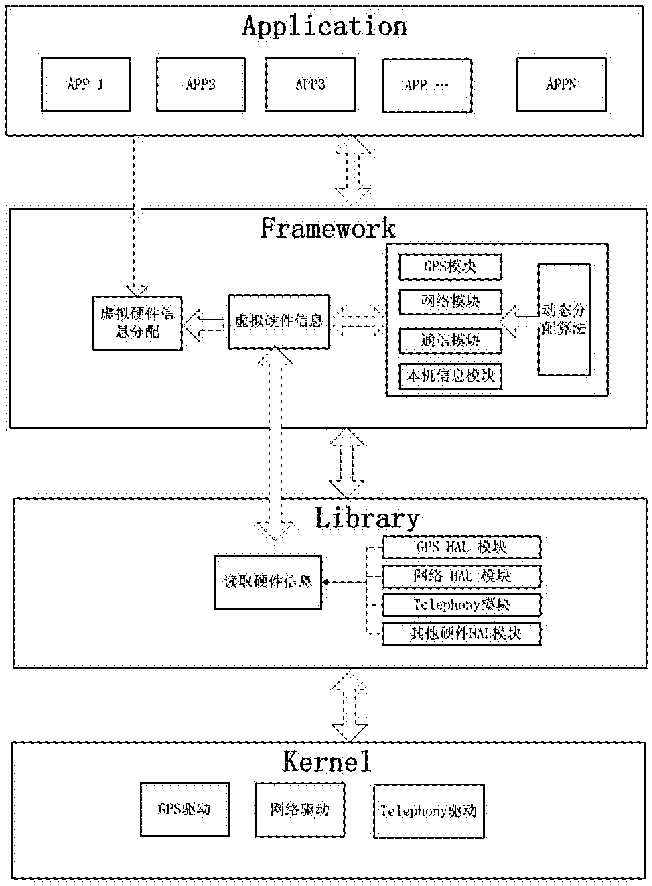 本发明一种单移动设备虚拟多个移动设备的方法,在单个移动设备内同时打开N个相同的应用程序时,先读取本移动设备的硬件信息,然后通过虚拟硬件信息模块动态配置N组两两互不相同的虚拟硬件信息组给该N组APK,使得在不同的应用程序中的虚拟硬件信息组内容两两互不相同,因此,该N个相同的应用程序在同一台移动终端上运行时不会产生冲突,使得单个移动设备允许同时安装多个相同的应用程序,方便用户在单个移动设备上同时操控相同应用程序的多个账户,不需要通过频繁退出/登录账户来进行账户切换。