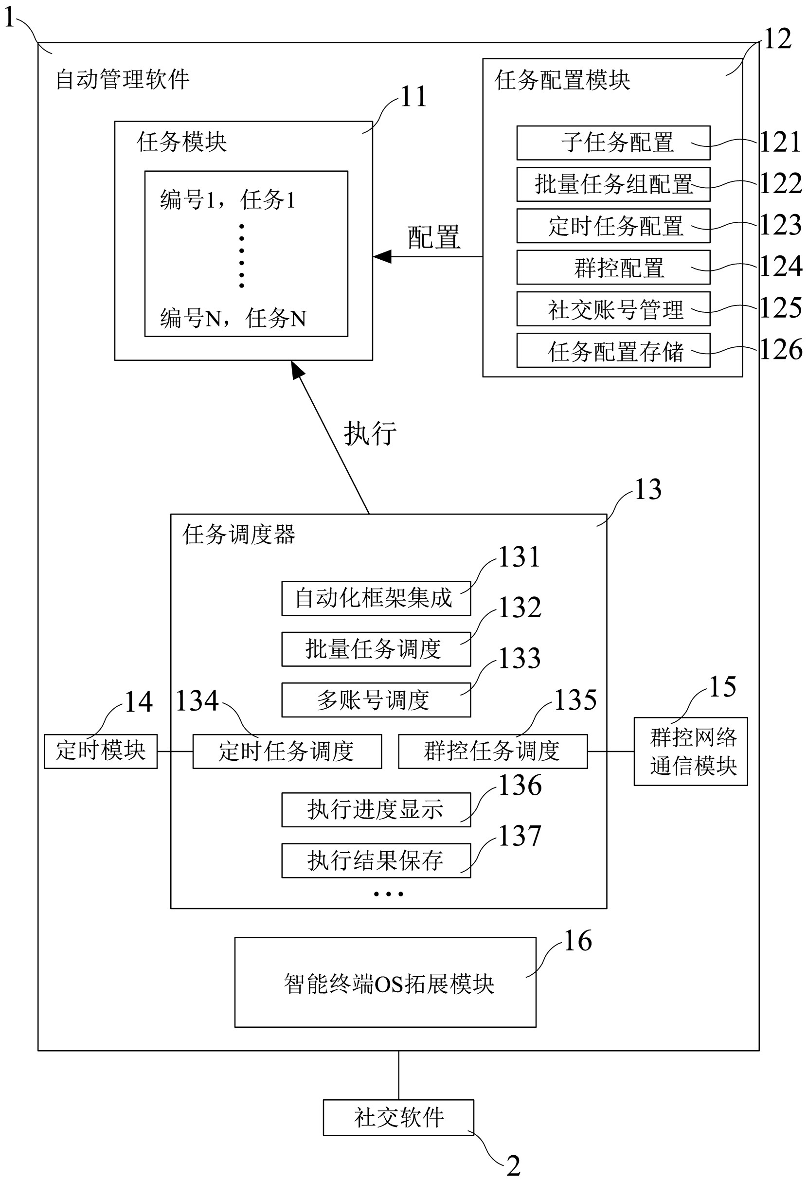 本发明公开一种智能终端的自动营销系统,其操作系统是Android系统,自动化操作基于Robotium及UiAutomator框架;自动营销系统包括自动管理软件和社交软件,自动管理软件包括任务模块、任务配置模块、任务调度器、定时模块和群控网络通信模块;任务模块中配置有所有子任务,各子任务记录完成某种目的的多个模拟操作的组合及相关可配置参数;任务配置模块用以用户自主设置任务的执行参数;任务调度器用以控制模拟操作的执行;定时任务调度用以对接定时模块;群控任务调度用以对接群控网络通信模块。采用上述系统及方法后,本发明的模拟操作基于Robotium和UiAutomator框架实现,无需依赖电脑,降低营销成本、提高灵活性和便携性,实现高效、低人力成本的营销,满足新型营销模式的需求。