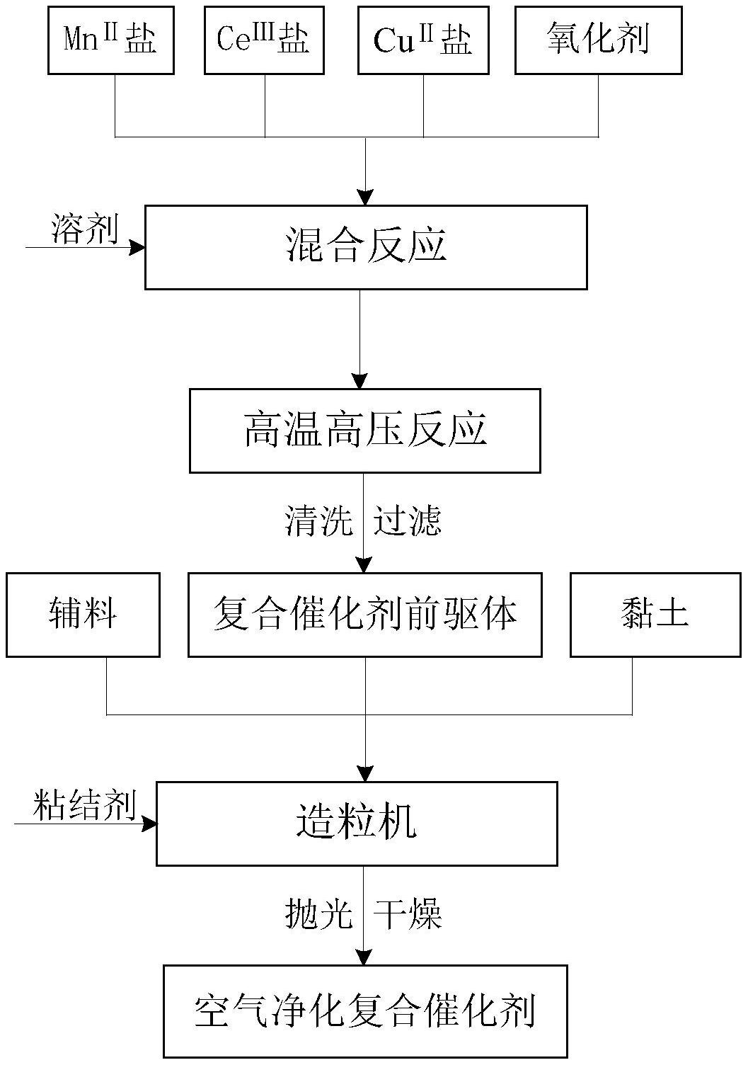 本发明公开了一种空气净化复合催化剂及其制备方法,空气净化复合催化剂包括锰氧化物复合铜氧化物和铈氧化物。该制备方法将氧化剂、MnII盐、CuII盐和CeIII盐溶解到溶剂中,搅拌反应后转移到高压反应釜,经过高温高压反应后再过滤清洗干燥,得到复合催化剂前驱体;将所述复合催化剂前驱体与辅料及黏土混合得到复合造粒粉料;将复合造粒粉料进行造粒得到空气净化复合催化剂。本发明制备的复合催化剂表面活性高,催化性能高。