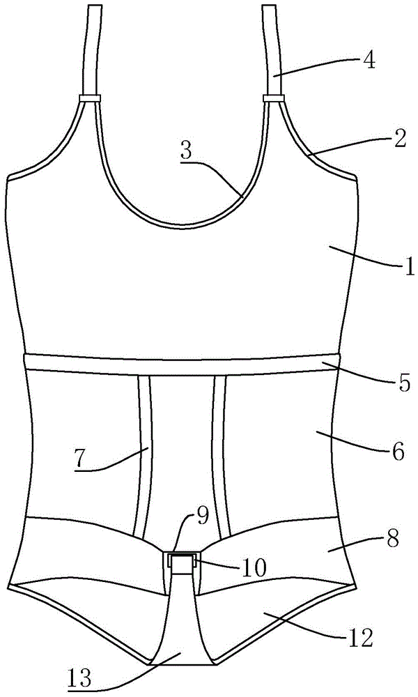 本实用新型涉及连体衣技术领域,尤其是一种后脱式塑形连体衣,包括上衣部,所述上衣部上端中部开设有衣襟口,所述上衣部上端两侧开设有袖口,所述袖口位于所述衣襟口两侧,所述衣襟口两侧固定缝制有肩带,所述上衣部下端固定缝制有塑形部,所述塑形部下端固定缝制有网纱部,所述网纱部下端缝制有下衣部,所述下衣部后侧固定缝制有裆部带,所述裆部带端部固定缝制有第二魔术贴,所述裆部带端部还缝制有第二挂扣,所述网纱部正面中部固定缝制有连接部,该连体衣穿着效果好,值得推广。