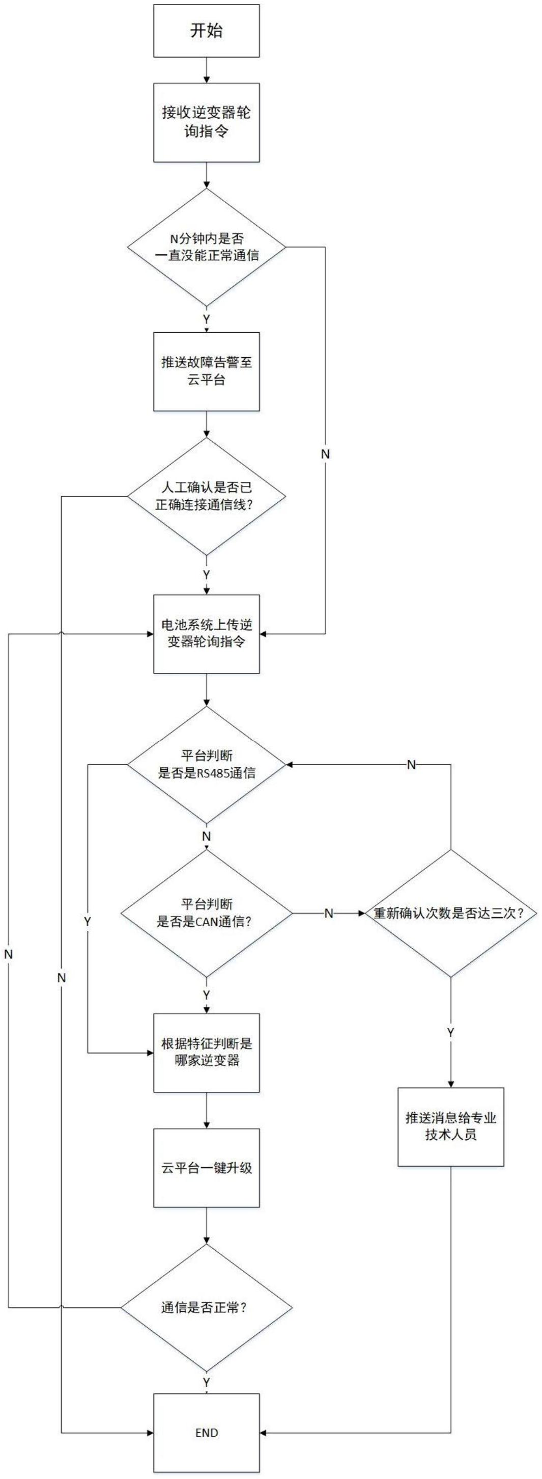 本发明提供一种储能系统多种通信协议自适应的方法及系统,属于储能系统应用领域。本发明方法包括如下步骤:储能系统的电池系统接收逆变器轮询指令;电池系统如果在一定时间内不能与逆变器正常通信,则上传故障告警给云平台;电池系统上传逆变器轮询指令;云平台根据逆变器轮询指令识别并确认逆变器厂家的通信协议;云平台根据匹配结果找到对应的升级文件,下发给电池系统;电池系统接收升级文件后进行升级,自适应协议匹配完毕。本发明的有益效果为:大大提高安装效率,降低售后维护成本。