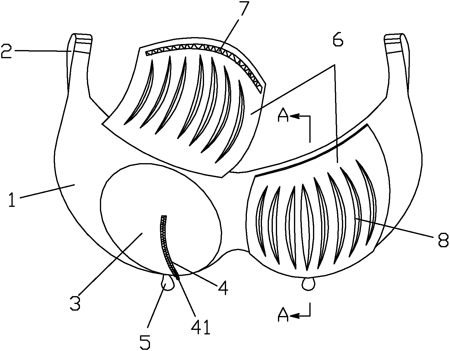 本实用新型涉及文胸技术领域,尤其是一种哺乳文胸,包括文胸本体,所述文胸本体的两端均缝制有背带,所述文胸本体上设有对称的罩杯,所述罩杯与文胸本体缝合为一体结构,所述罩杯的中心线上均开设有长条缝,所述长条缝的一端位置罩杯的中心上方,另一端延伸到文胸本体的下边缘,所述长条缝内缝合有拉链,所述拉链的开口端位于文胸本体的下边缘位置,所述罩杯的上方均设有遮挡布,所述遮挡布的一端固定缝制在所述文胸本体的上边缘,所述遮挡布远离缝合的一端设有弹性带,所述弹性带缝合在牵布块上。本实用新型在哺乳时,可有效避免乳房外漏,值得推广。