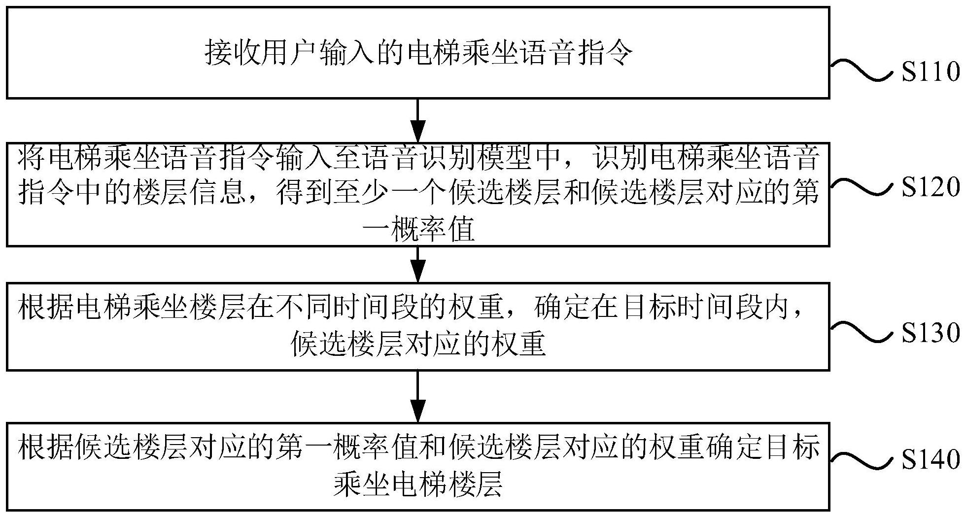 本发明实施例提供了一种电梯楼层确定方法、装置、设备及计算机可读存储介质。该电梯楼层确定方法包括接收用户输入的电梯乘坐语音指令,将电梯乘坐语音指令输入至语音识别模型中,识别电梯乘坐语音指令中的楼层信息,得到至少一个候选楼层和候选楼层对应的第一概率值,根据电梯乘坐楼层在不同时间段的权重,确定在目标时间段内,候选楼层对应的权重,权重是根据电梯的历史乘坐信息确定的;目标时间段为用户输入语音指令所属的时间段,根据候选楼层对应的第一概率值和候选楼层对应的权重确定目标乘坐电梯楼层。根据本申请实施例,能够在确定用户期望到达楼层的过程中,提高确定用户期望到达楼层的准确性,提高了用户的体验。