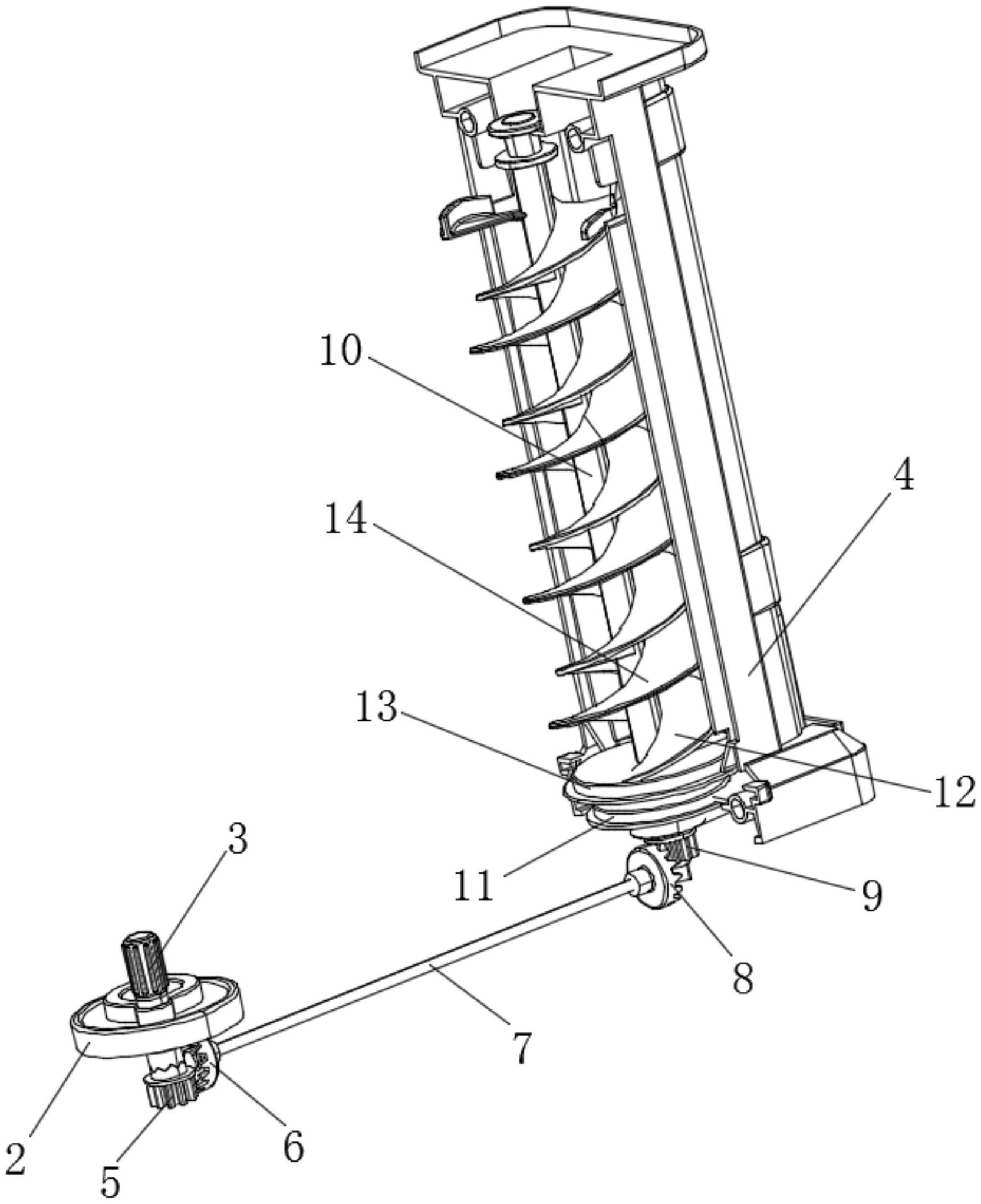 本实用新型涉及轨道玩具及积木玩具技术领域,公开了一种螺旋升降机构,包括:积木底座和升降外壳,所述升降外壳内部中央设有转轴,所述转轴外壁设有第一螺旋叶片和第二螺旋叶片,所述转轴底端设有从动齿轮,固定座顶部中央设有转座,转座底端设有主动齿轮,本实用新型在螺旋叶片起始部分,利用螺旋角度将玩具小车切入旋转轨道中,玩具小车跟随螺旋轨迹同步上升,当达到最高点时,玩具小车通过螺旋偏移,脱离螺旋轨迹,多组驱动动作机构下因为同驱动源条件下,多组动作机构间的动作协调更为自然,更为顺畅灵活,在应用成本上之前比传统的多驱动结构,更为简单,成本更低。