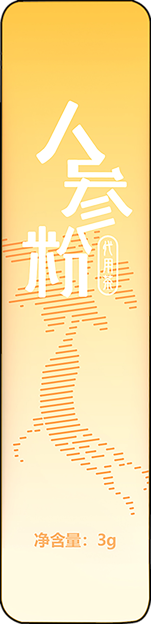 1.本外观设计产品的名称:包装袋(人参粉)。2.本外观设计产品的用途:用于放置产品的包装袋。3.本外观设计产品的设计要点:在于图案。4.最能表明设计要点的图片或照片:主视图。5.本外观设计产品为薄型产品,省略其他视图。