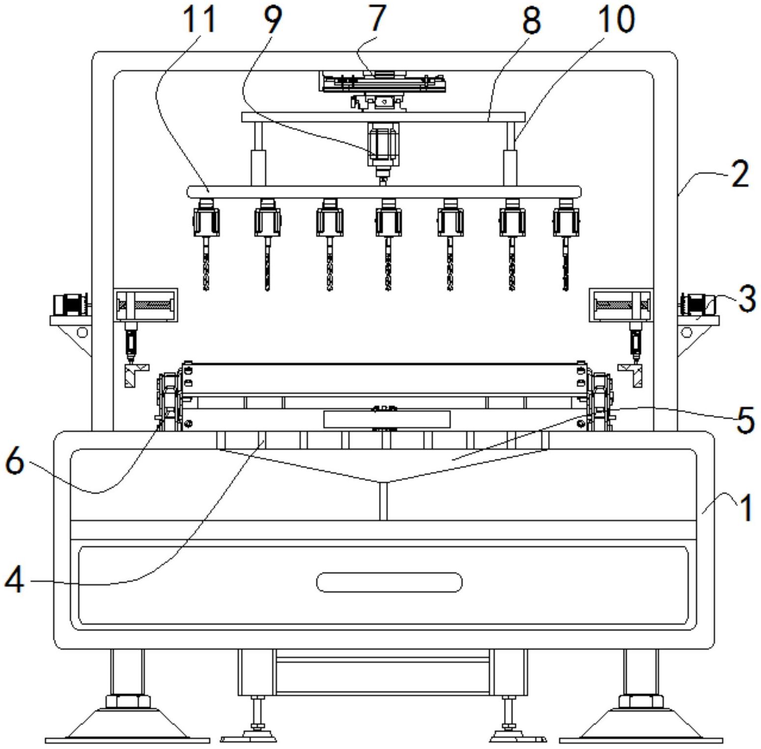 本实用新型涉及一种木方自动送料七孔机,包括箱体,所述箱体上表面固定有支撑架,所述支撑架的左右两侧设有夹持机构,所述箱体上表面开设有用于收集碎屑且数量不少于两个的流通孔,所述箱体内腔的顶壁设有收集机构,所述箱体的后方设有传送装置,所述支撑架内腔的顶壁设有用于移动打孔机的移动装置,所述固定板的下表面固定有用于调节打孔机高度的第一电动推杆。该木方自动送料七孔机,夹持机构可以将需要打孔的板材进行位置固定,方便进行精准打孔,通过第一电机和第二电动推杆带动夹持块将板材进行固定,同时可以通过移动装置的位置移动对板材进行位置选取打孔,大大增加了七孔机的打孔准确性与实用性。
