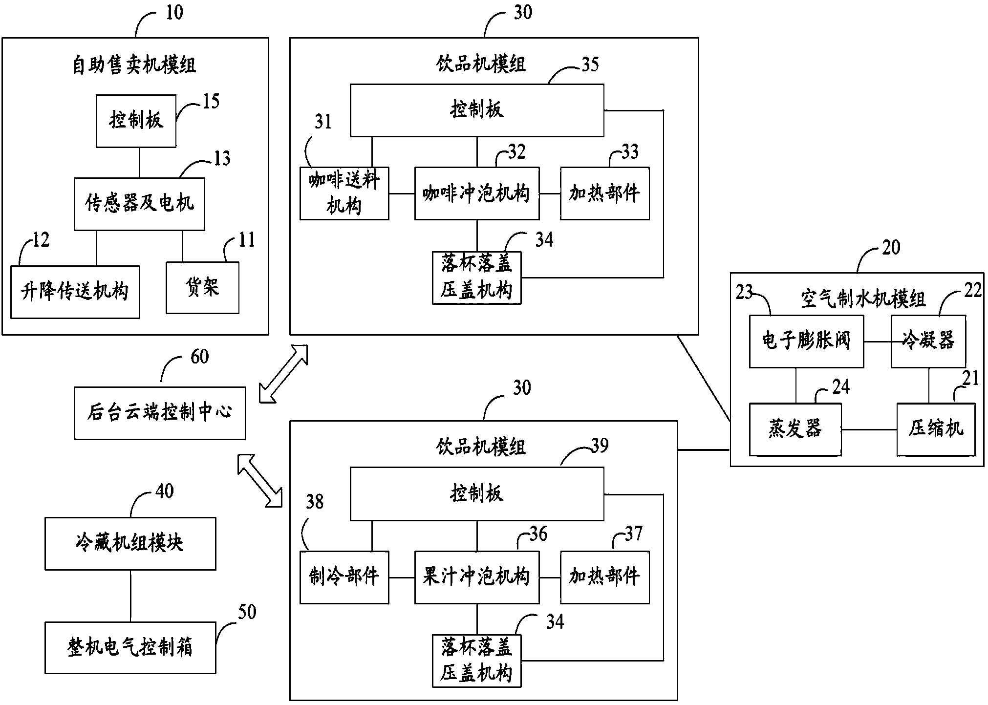 本实用新型提供了一种自助售卖组合柜,包括:自助售卖机模组、空气制水机模组、饮品机模组、冷藏机组模块和整机电器控制箱。本实用新型所述自助售卖组合柜,通过设置单独的功能模组:自助售卖机模组、空气制水机模组、饮品机模组、冷藏机组模块和整机电器控制箱的形式,实现了在一种组合柜上售卖多种不同种类的商品目的,为消费者提供了便利,为运营商降低了设备成本、管理成本和维护成本,还可以根据实际需求自由组合多个所述功能模组以适应不同的运营需求。