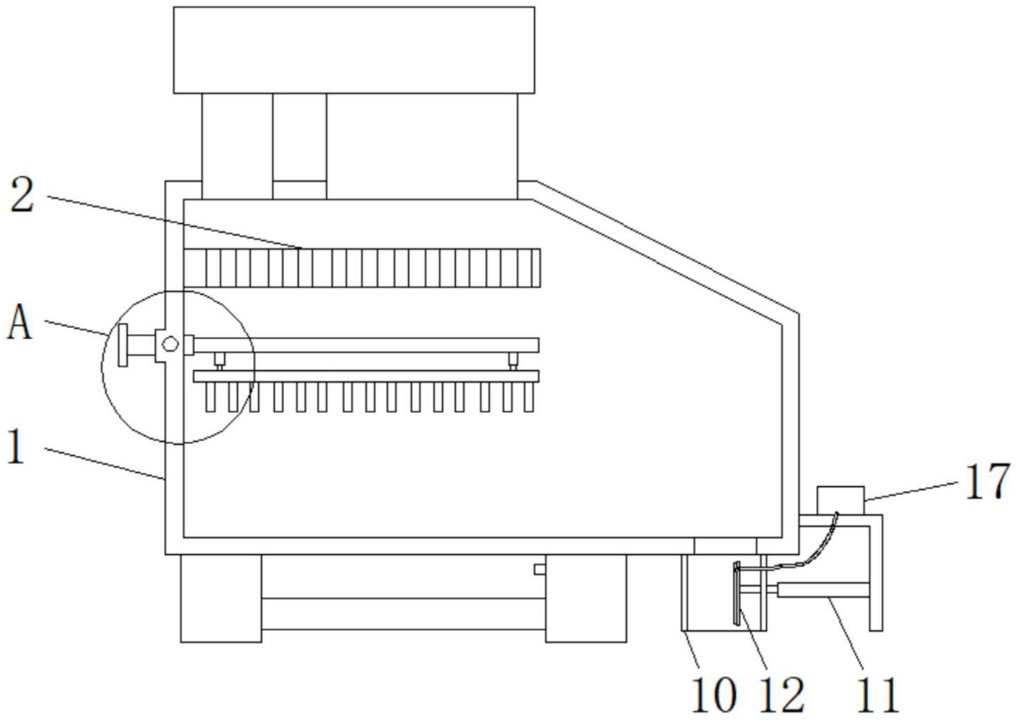 本实用新型涉及大米去石机技术领域,尤其是一种具有进风调节装置的吸式比重分级去石机,包括主体,所述主体的内部安装有筛网,所述主体的外部设置有贯穿主体侧壁并延伸至其内部的转轴,所述转轴的一端固定连接有第一横板,所述第一横板的底部安装有升降柱,所述升降柱的底部固定连接有第二横板,所述第二横板的底部设置有插条,有益效果在于:当筛网被堵塞的时候转动转轴,原先第一横板位于顶部,在转动转轴之后第二横板位于第一横板的顶部,转轴在转动结束之后第一气缸的输出端伸出并插入插孔的内部,有利于对转轴限位防止转轴转动,之后升降柱带动第二横板上升,第二横板上升的时候其顶部的插条插入筛网的孔内,有利于将堵塞网孔的杂质清理。