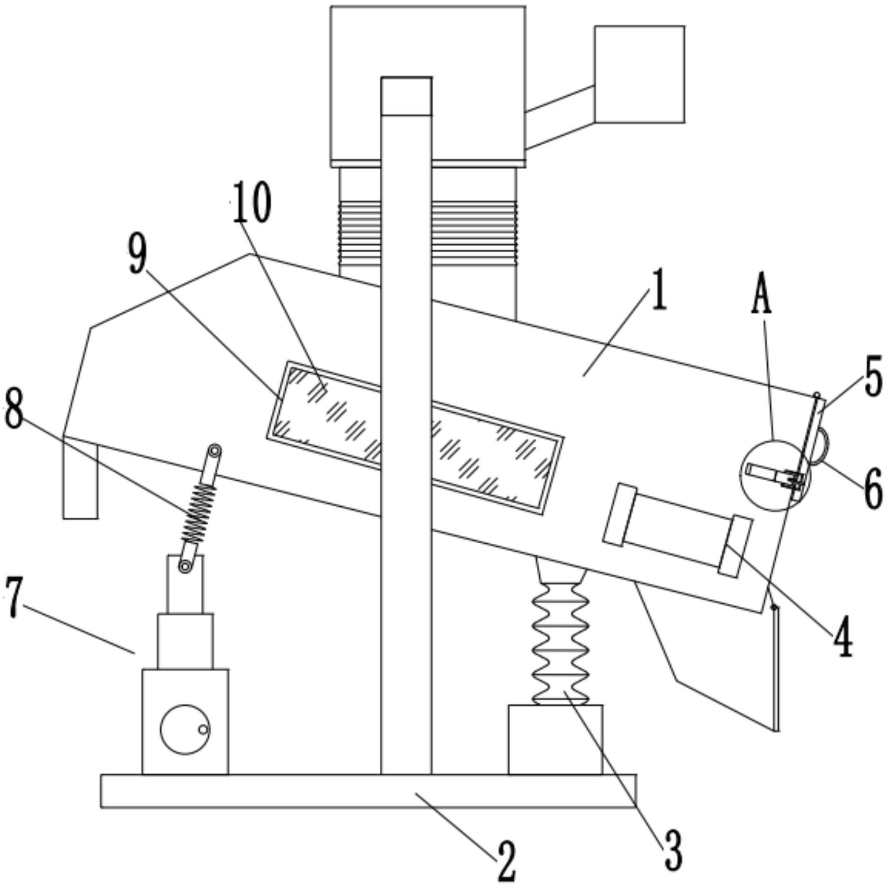 本实用新型公开了一种大米加工用吸式比重分级去石机,包括筛箱,筛箱的一侧外壁通过合页连接有密封板,密封板的一侧外壁通过螺栓连接有把手,密封板的外壁焊接有挂钩,筛箱的外壁焊接有固定板,固定板的外部铰接有旋转板,旋转板的一端铰接有挂环,挂环与挂钩相适配。本实用新型通过设置的旋转板、挂环和挂钩,对旋转板进行转动,使得挂环与挂钩分离,此时即可方便的将密封板进行打开,使得筛箱内部的筛面堵塞时便于对筛箱进行打开清理。