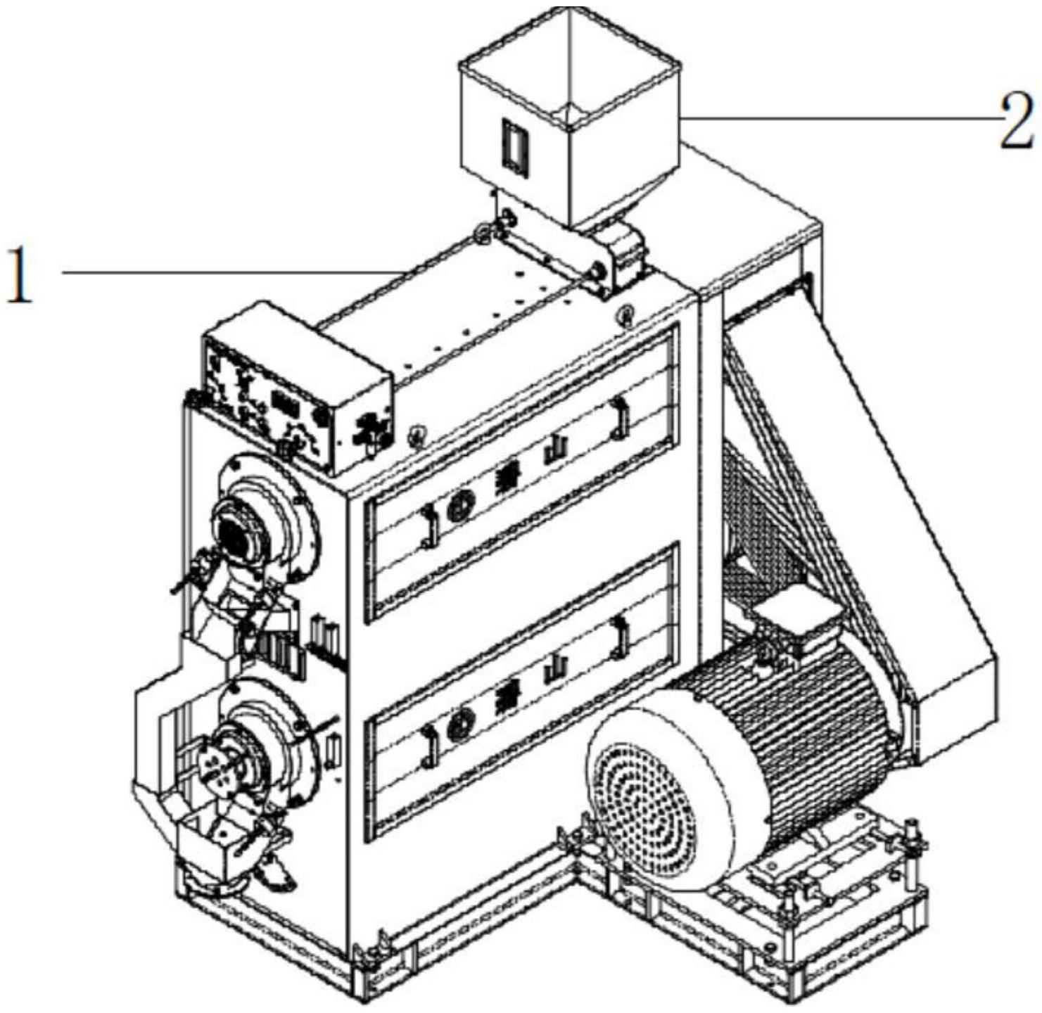 本实用新型涉及白米抛光机技术领域,尤其是一种隐式支承机构立式双辊白米抛光机包括抛光机,所述抛光机的顶部设置有进料斗,所述进料斗的外壁固定安装有热风机,所述进料斗的内壁固定连接有两组空心斜板,所述空心斜板的顶部设置有排风口,所述热风机的一端连接有延伸至空心斜板内部的排风管,所述空心斜板的底部连接有两组夹块,有益效果在于:大米在除湿之后会顺着空心斜板进入流通罩的内部,此时马达带动扇叶高速转动,大米进入流通罩内部的时候为垂直下降,所以扇叶能够将大米中的米灰从排灰口排出,有利于提高大米的洁净度,然后吸尘器启动,排出的米灰通过吸嘴与吸管进入吸尘器的内部,有利于对米灰收集。