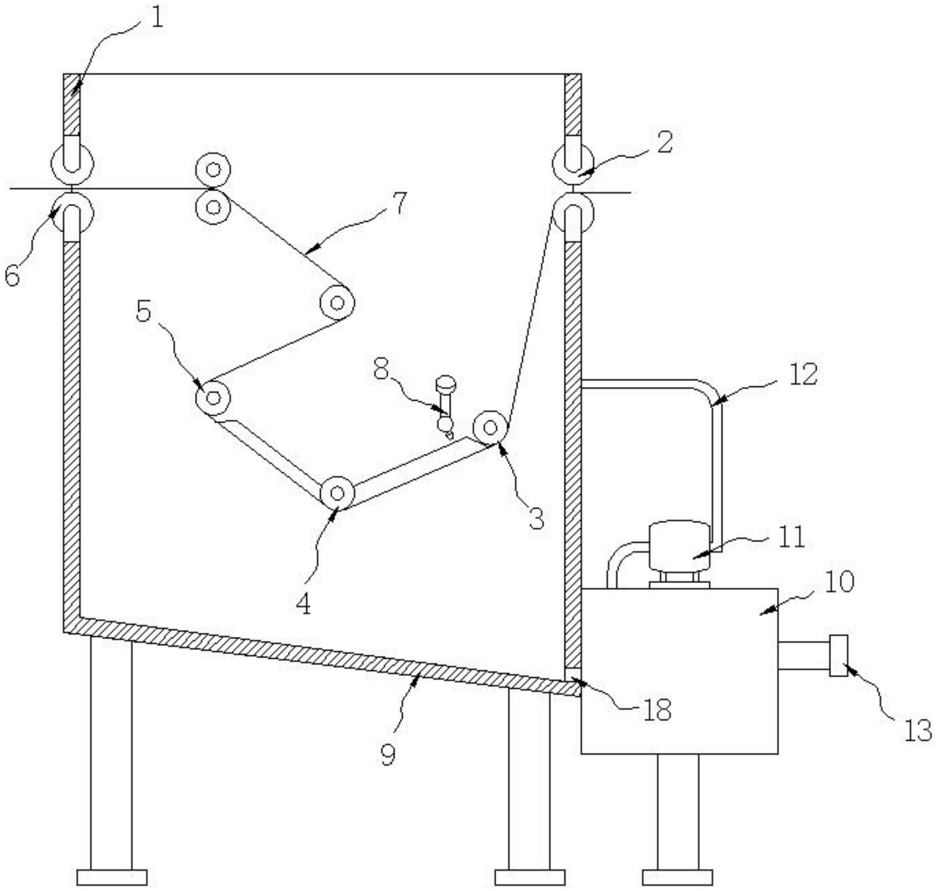本实用新型提供一种水刺无纺布生产用染色装置,包括染色装置本体,所述染色装置本体包括染色桶、限位导辊、喷管和染料箱,所述染色桶的一侧安装有进料导辊,所述进料导辊通过布料与牵引导辊连接,所述牵引导辊的一侧安装有限位导辊,所述限位导辊的表面套设有卡环,所述卡环的两侧安装有挡杆,所述限位导辊的一侧安装有挤压导辊,所述挤压导辊的一侧设置有出料导辊,所述染色桶的底端设置有底板,所述底板的一侧开设有排料口,所述排料口的外侧安装有染料箱,该水刺无纺布生产用染色装置能够快速对表面进行染色,并促进渗透到内部,能避免同一种染料产生的色差,染色区域可控。