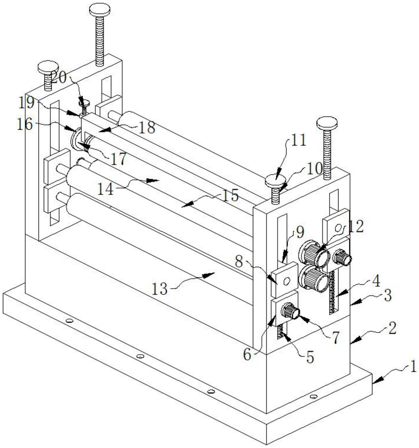 本实用新型提供一种用于水刺无纺布生产的压花装置,包括压花装置本体,所述压花装置本体包括底座,所述底座的顶部固定有固定座,所述固定座的底部焊接有固定板,所述固定板上开有固定槽,所述固定槽的内部固定有支撑弹簧,所述支撑弹簧的顶部安装有支撑座,所述支撑座上安装有电机一,所述支撑座的顶部安装有活动座,所述活动座上安装有螺纹杆,所述螺纹杆的顶部固定有把手,所述活动座和支撑座上均安装有连接滚筒。该用于水刺无纺布生产的压花装置通过螺纹杆调整连接滚筒的位置,使两处的连接滚筒进行高低不同的快速调整,从而对布料的松紧程度进行快速的调整使用。