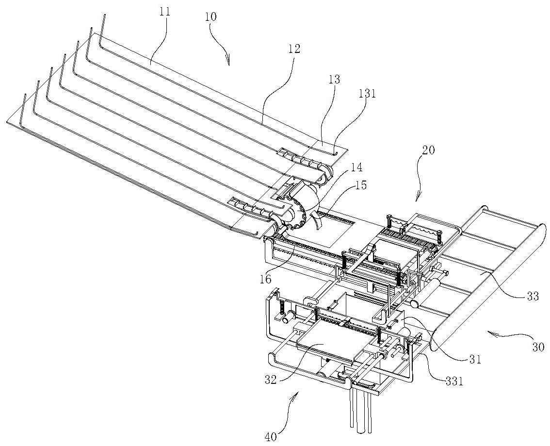 本发明涉及一种阵列式LED灯珠导线焊接系统,包括线束供料装置,线束供料装置的出口设置有导线分开装置,导线分开装置用于将到导线的引脚分开,导线分开装置的旁侧设置有阵列式LED灯珠的供料装置,阵列式LED灯珠的供料装置上设置有引脚导送压接装置,引脚导送压接装置旁侧设置有引脚焊接装置,引脚焊接装置用于将导线引脚焊接在阵列式LED灯珠的接线端子位置以实施对导线引脚与接线端子焊接操作,该系统可有效提高对LED灯珠加工效率的同时,确保导线焊接的可靠度。