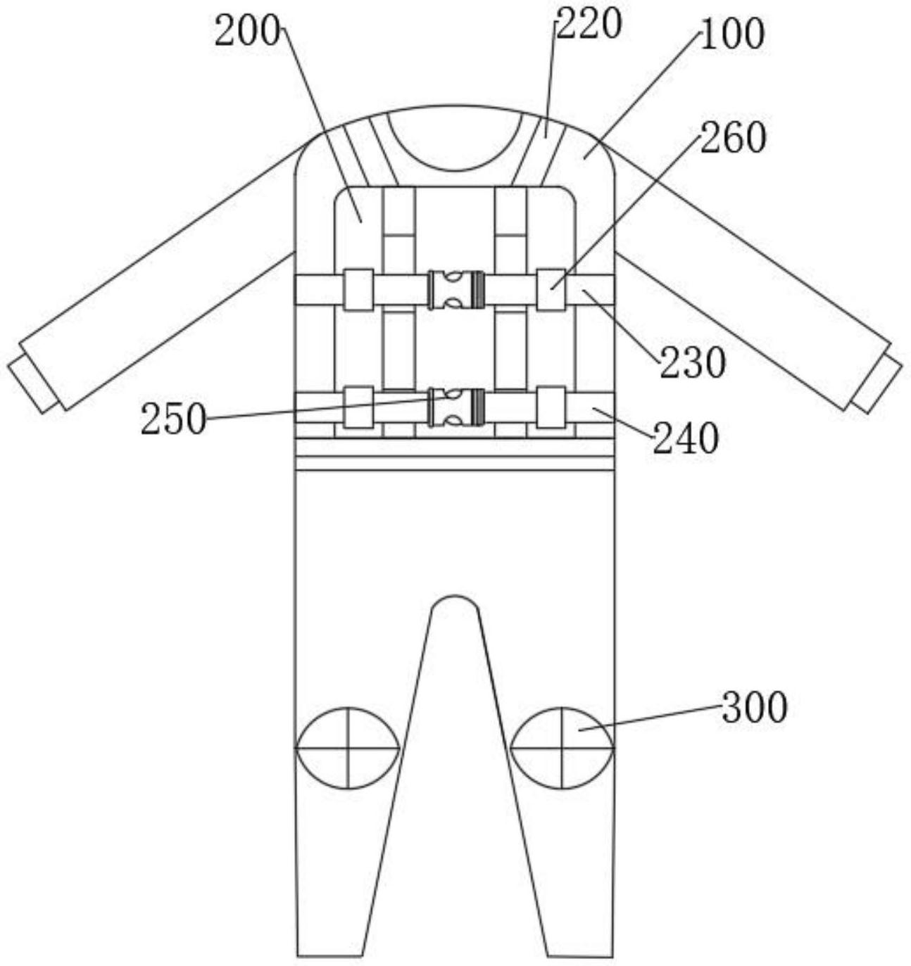 本实用新型属于防护服技术领域,具体为一种适用于危险性训练的防护服,包括防护服本体、胸气囊、护膝、电源和散热扇,所述防护服本体的外壁固定设置有耐磨颗粒,且耐磨颗粒的材质为橡胶材料,所述防护服本体的前后端分别设置有胸气囊和背气囊,所述胸气囊的顶端固定设置有第一绑带,该种适用于危险性训练的防护服的防护服本体、胸气囊、护膝、电源和散热扇等依序衔接,结构简单,投资成本低,通过在防护服本体的外壁设计有橡胶颗粒来增加其整体耐磨程度,由于防护服内密不透风,夏天穿戴可能引起不适,该种防护服还设置有小型散热扇,可进行主动散热工作,提高穿戴舒适度。