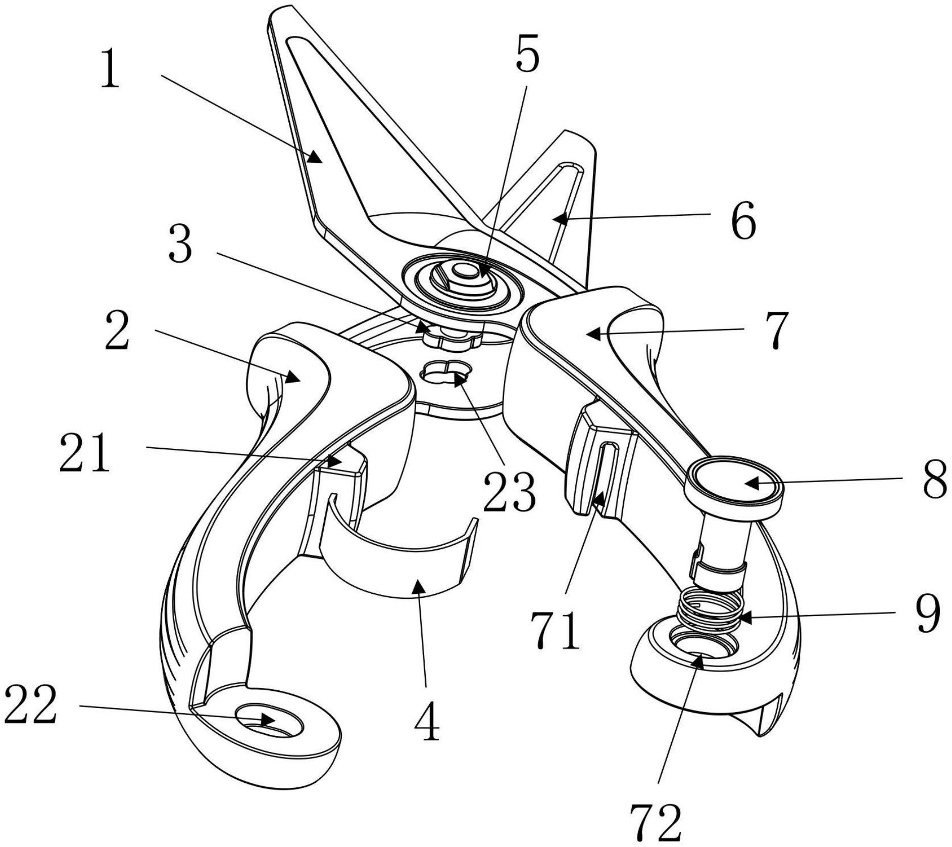 本实用新型涉及一种设置有弹力锁装置的可拆卸厨房剪,包括第一手柄和第二手柄,第二手柄的前端连接有第二剪片,第一手柄的前端连接有第一剪片,第一剪片和第二剪片通过螺钉交叉紧配,第一手柄和第二手柄之间设置有弹片,第一手柄和第二手柄的末端通过锁扣装置连接;第二手柄内侧设置有凸台,弹片左端紧固于第二手柄的凸台上,第一手柄设置的凸台上有单边开放凹槽,弹片右端属于活动状态或卡入凸台凹槽中。本实用新型通过轻轻抓握剪刀柄,此时手柄末端弹力锁结构打开,弹片自动伸张弹开手柄,使用方便,同时弹片形态宽度距离也可以起到限位作用,限制两剪片张开最大夹角,保证剪片不达到拆卸角度,剪片不易脱落,特定张角使手柄握持更合理舒适。