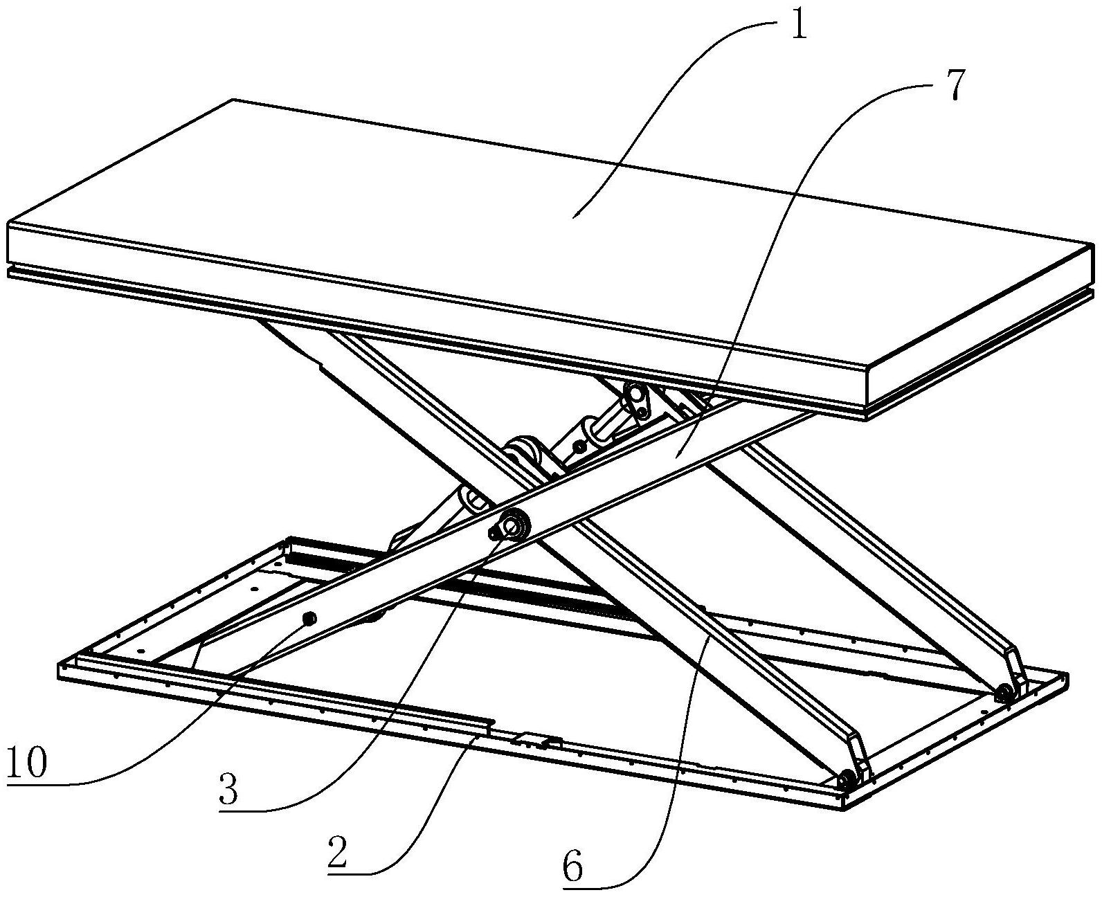 本实用新型公开了一种无纺布滚筒安装用升降平台,其技术方案要点包括台面、底座以及设置于台面与底座之间的升降装置,所述升降装置为剪刀式升降装置;所述升降装置包括转动轴;所述升降装置包括外臂架以及内臂架;所述外臂架与内臂架之间通过转动轴转动连接;所述内臂架与底座转动连接;所述外臂架与台面转动连接;所述内臂架包括中空设置的方形管;所述转动轴于方形管内穿过;所述升降装置还包括驱动部;所述驱动部一端与方形管转动连接,另一端与外臂架转动连接;所述外臂架上可拆卸的设置有连接座;所述连接座与驱动部转动连接,本实用新型具有效率高,节省人力,便于操作使用的有益效果。