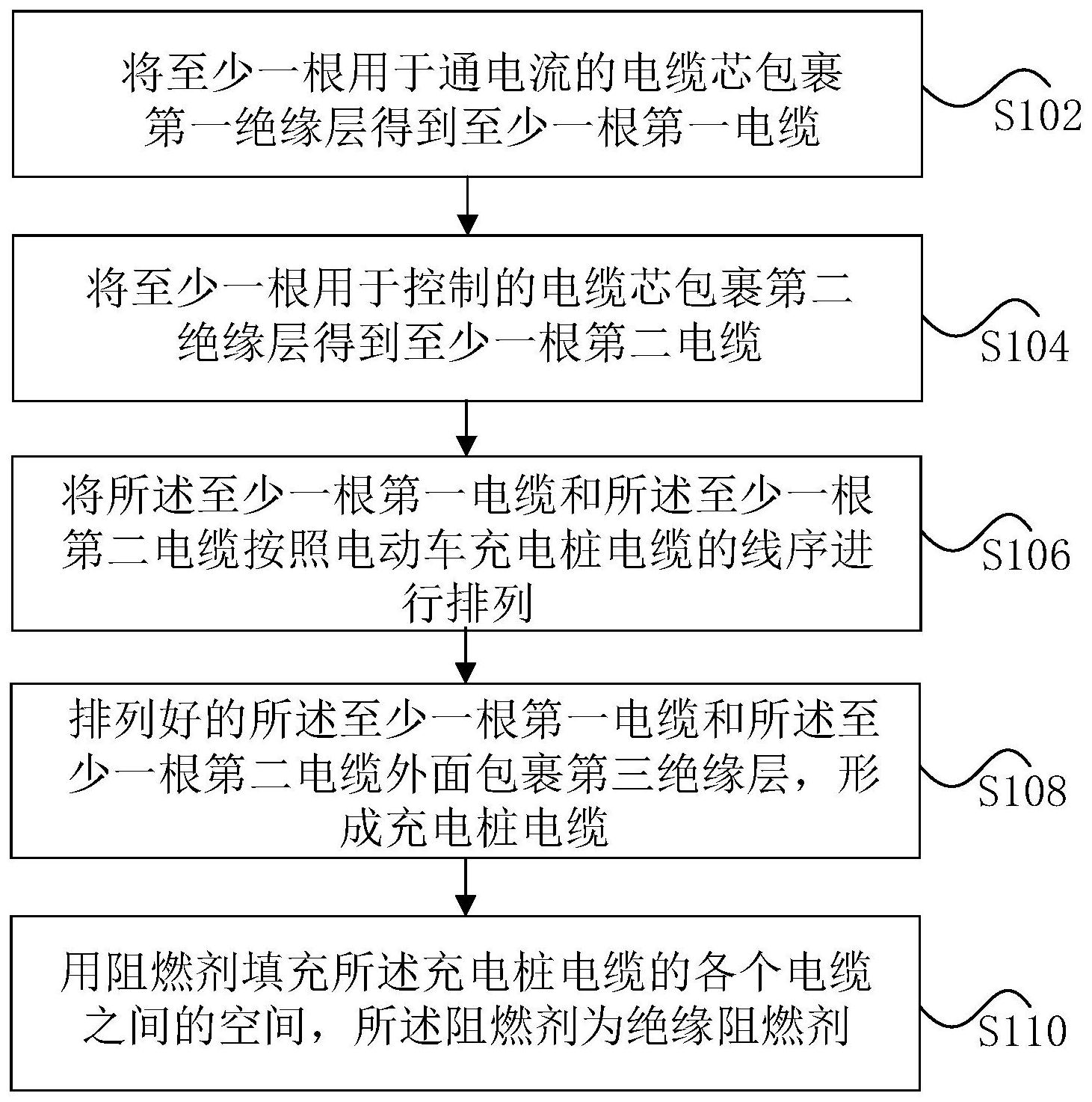 本申请公开了一种使用复合阻燃剂生产充电桩电缆方法及充电桩电缆,该方法包括:将至少一根用于通电流的电缆芯包裹第一绝缘层得到至少一根第一电缆;将至少一根用于控制的电缆芯包裹第二绝缘层得到至少一根第二电缆;将所述至少一根第一电缆和所述至少一根第二电缆按照电动车充电桩电缆的线序进行排列;排列好的所述至少一根第一电缆和所述至少一根第二电缆外面包裹第三绝缘层,形成充电桩电缆;用阻燃剂填充所述充电桩电缆的各个电缆之间的空间,所述阻燃剂为绝缘阻燃剂。通过本申请解决了现有充电电缆无法满足要求的问题,从而提供了一种较为安全的充电桩电缆。