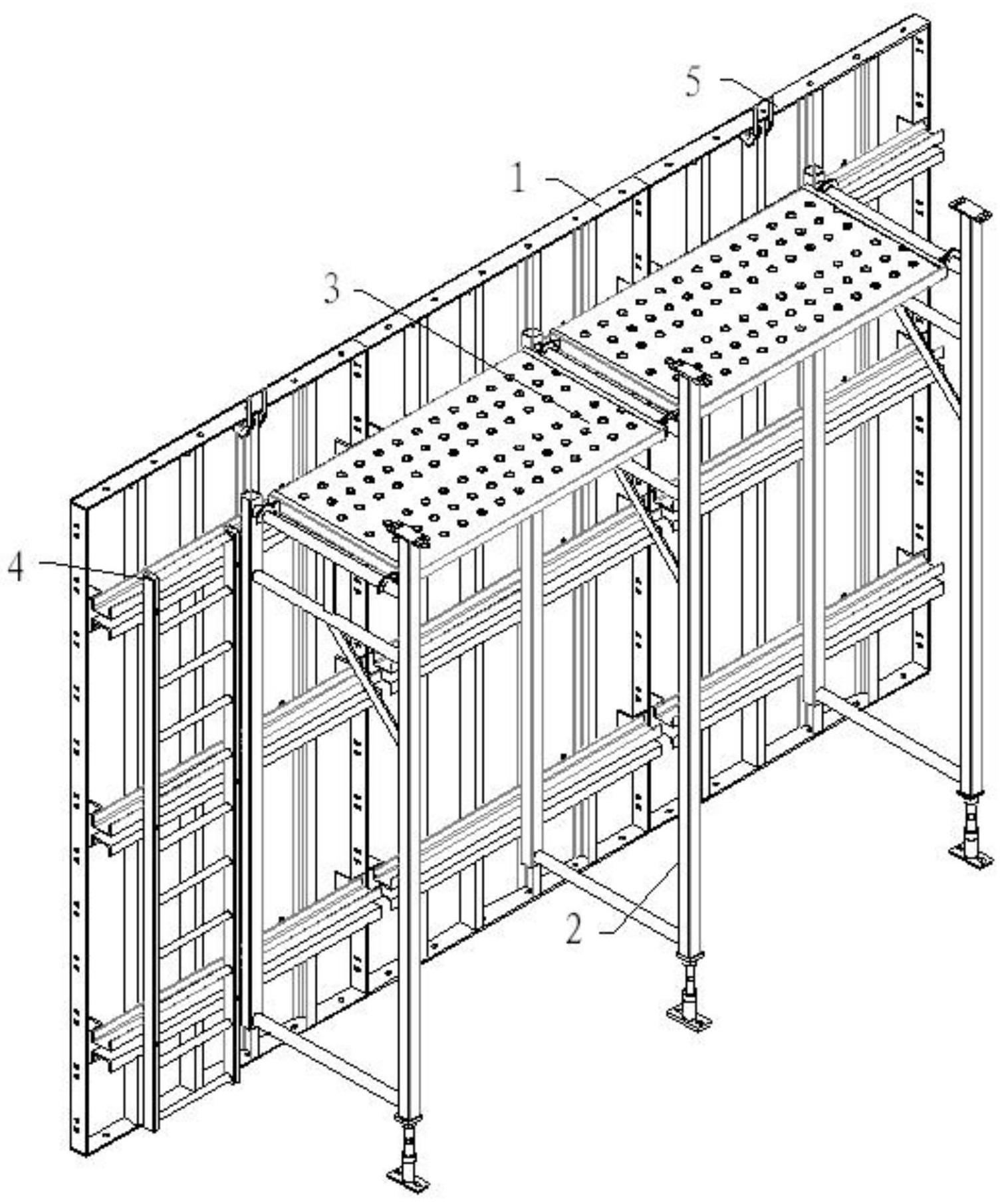 本实用新型提供了一种门型支撑式大钢模板,包括由多块钢模板组拼成的全钢模板、可拆卸式固定在全钢模板背面的多个门式支架,门式支架与全钢模板垂直设置构成墙体模板,并且在多个门式支架的顶部搭接自锁式钢平台,构成通行通道。本门型支撑式大钢模板通过设置在门式支架上的特殊结构,实现了工具式全钢模板中模板体系、支撑体系和人员通行体系的一体化设置。其中,支撑体系以模板体系为依托、通行体系又以支撑体系为依托,三者散拆运输、整支施工,紧密结合,浑成一体。并且,该门型支撑式大钢模板可以在高度方向上垂直叠加,从而使得两层或三层楼高的墙体可以一次浇筑,提高了施工效率,缩短了施工的工期。