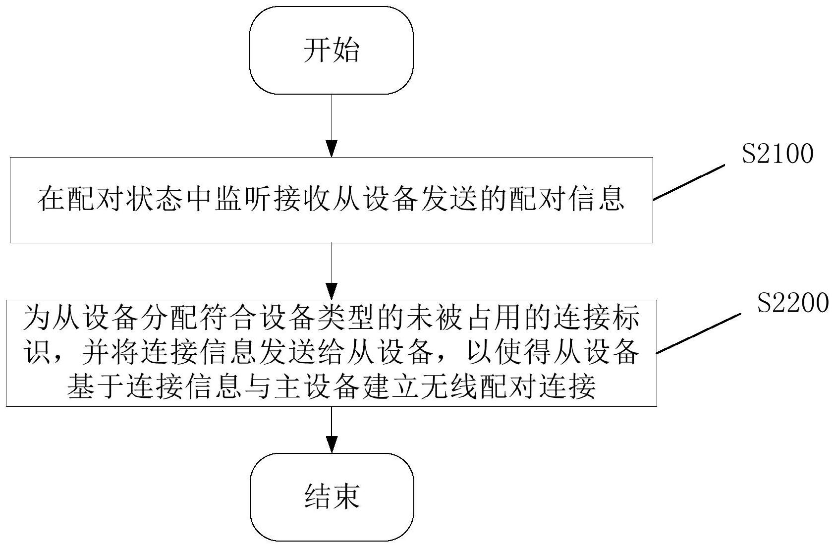 本发明公开了一种虚拟现实系统的配对连接方法、设备及虚拟现实系统。虚拟现实系统包括多个主设备和多个从设备,每个主设备支持与多个从设备建立无线配对连接,每个从设备只能与一个主设备建立无线配对连接,该方法通过主设备实施,包括:在配对状态中监听接收从设备发送的配对信息;为该从设备分配符合其设备类型的未被占用的连接标识,并将连接信息发送给该从设备,以使得该从设备基于连接信息与该主设备建立无线配对连接。根据本发明,可以无需有线连接实现配对。交互步骤少,缩短建立无线配对连接的耗时,提升建立无线配对连接效率。可以满足虚拟现实系统对于数据传输延时小、速率高的要求。