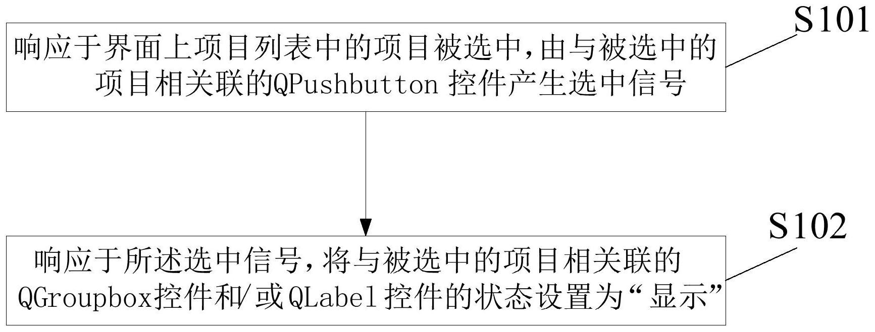 本发明公开了实现界面效果的方法、计算设备及存储介质。所述方法包括:响应于界面上项目列表中的项目被选中,由与被选中的项目相关联的QPushbutton控件产生选中信号;以及响应于所述选中信号,将与被选中的项目相关联的QGroupbox控件和/或QLabel控件的状态设置为“显示”,其中,所述QGroupbox控件围绕所述QPushbutton控件布置,所述QLabel控件邻近所述QPushbutton控件布置。本发明还涉及一种计算设备和一种存储介质。通过本发明各实施例,可以简单便捷地实现界面效果,使程序框架更清晰,功能更流畅。