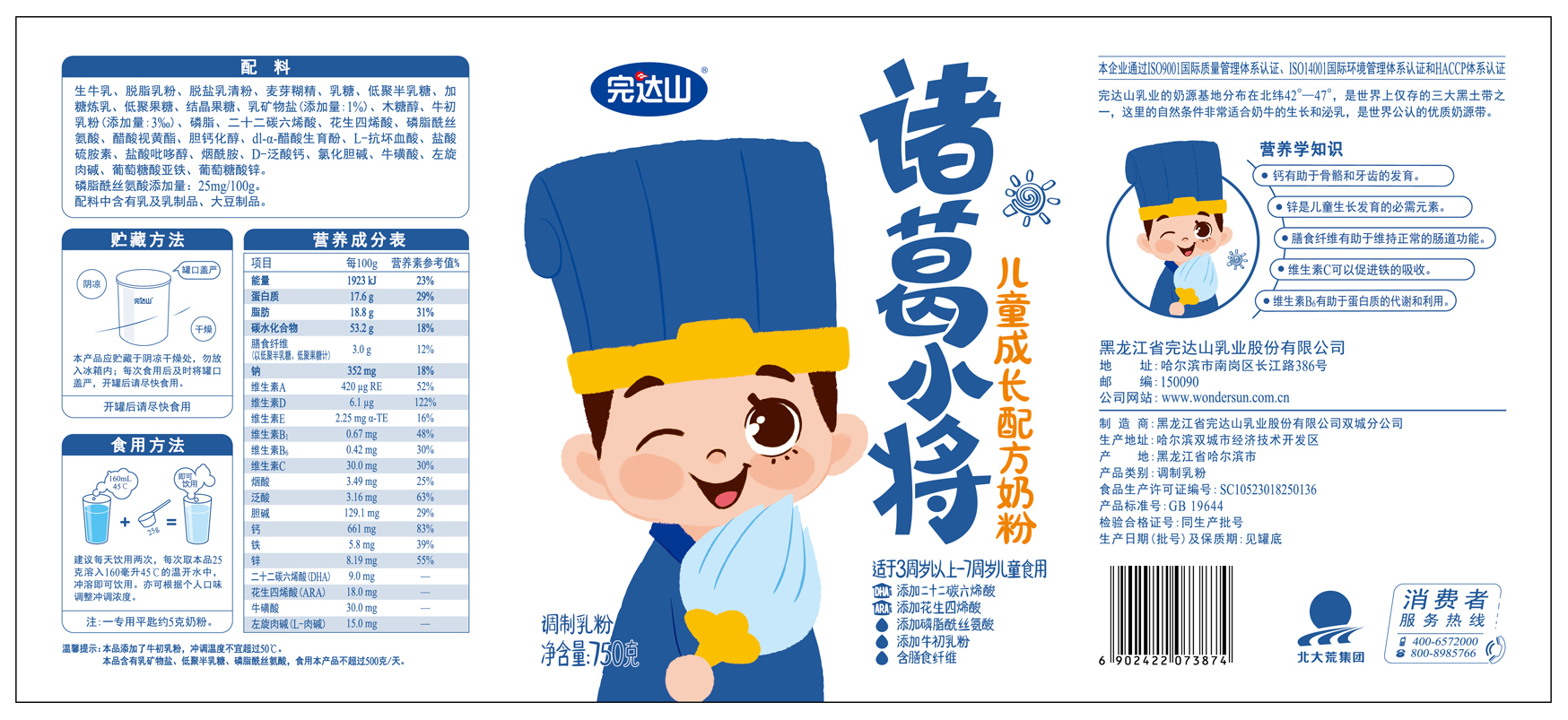 1.本外观设计产品的名称:标签(诸葛小将儿童成长配方奶粉)。2.本外观设计产品的用途:用于装饰产品包装。3.本外观设计产品的设计要点:在于图案。4.最能表明设计要点的图片或照片:主视图。5.本外观设计产品为平面产品,省略其他视图。