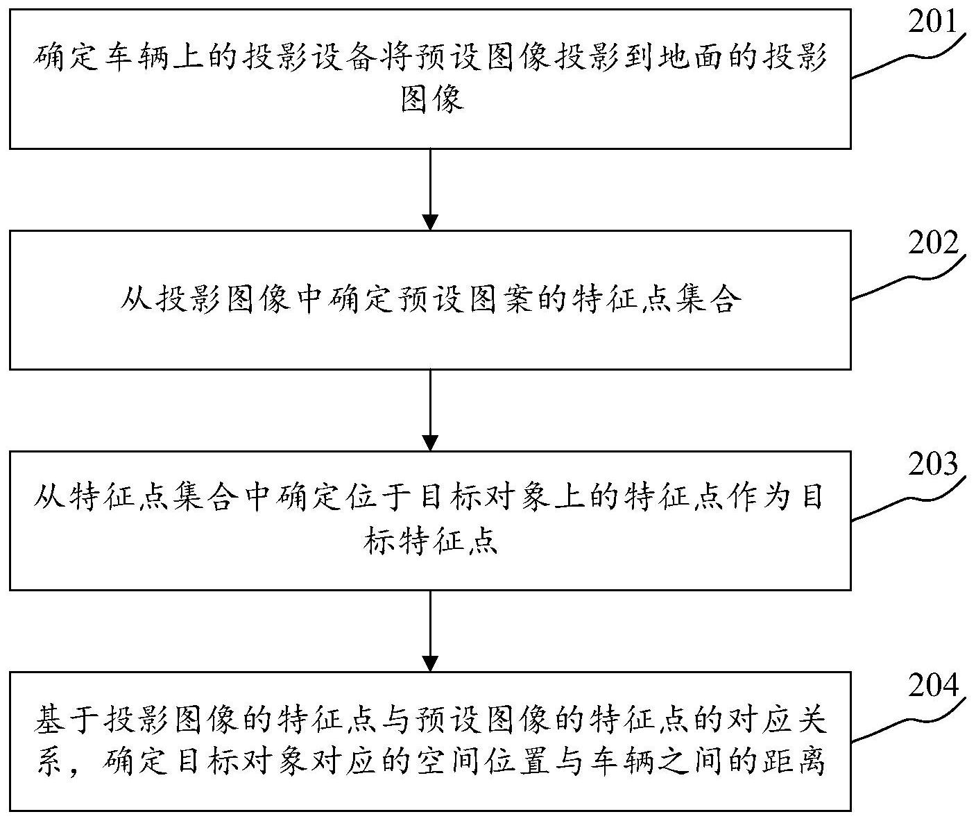 本公开实施例公开了一种测距方法、装置、计算机可读存储介质及电子设备,其中,该方法包括:确定车辆上的投影设备将预设图像投影到地面的投影图像,其中,投影图像中包含有预设图案;从投影图像中确定预设图案的特征点集合;从特征点集合中确定位于目标对象上的特征点作为目标特征点;基于投影图像的特征点与预设图像的特征点的对应关系,确定目标对象对应的空间位置与车辆之间的距离。本公开实施例由于采用了主动投影的方式进行测距,可以达到很高的测距精度,并且由于复用了车辆上的已有设备,实现了替代激光雷达等设备进行测距,因此大大节约了成本。